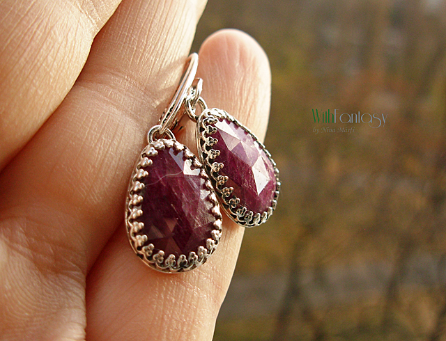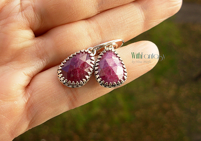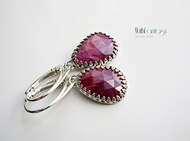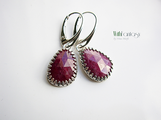 Klasszikus, romantikus, ezüst fülbevaló gyönyörű rubinokkal . Az ezüst fehér és polírozott.