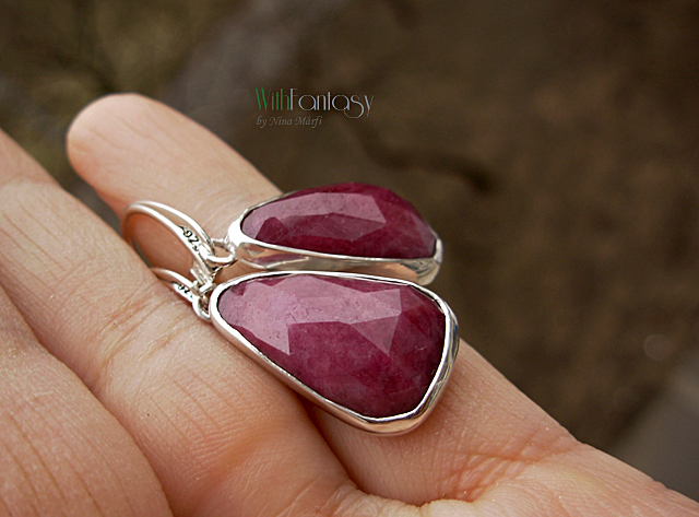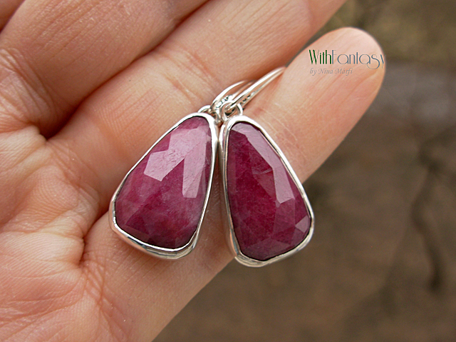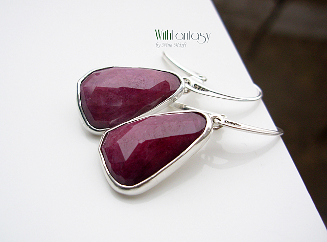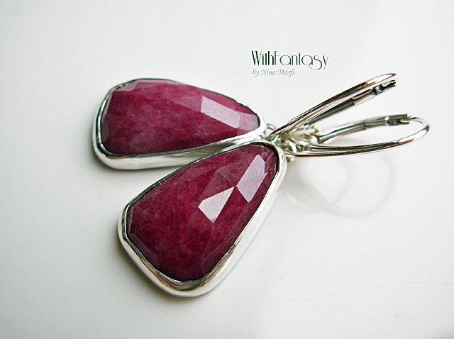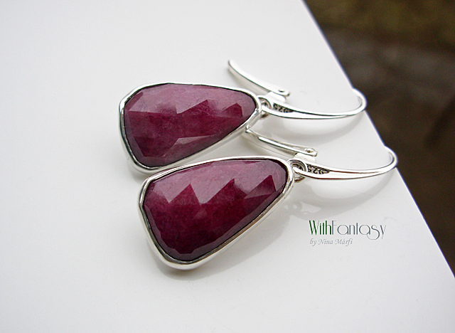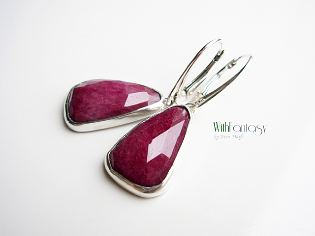 Egyszerű, minimalista, ezüst fülbevaló érdekes formájú és nagyon univerzális rubinokkal. A kövek gyönyörűek, nagyon jó minőségűek, intenzív málna színűek. Az ezüst fehér, polírozott.