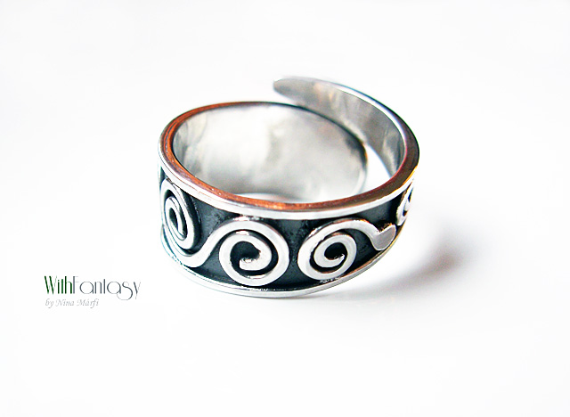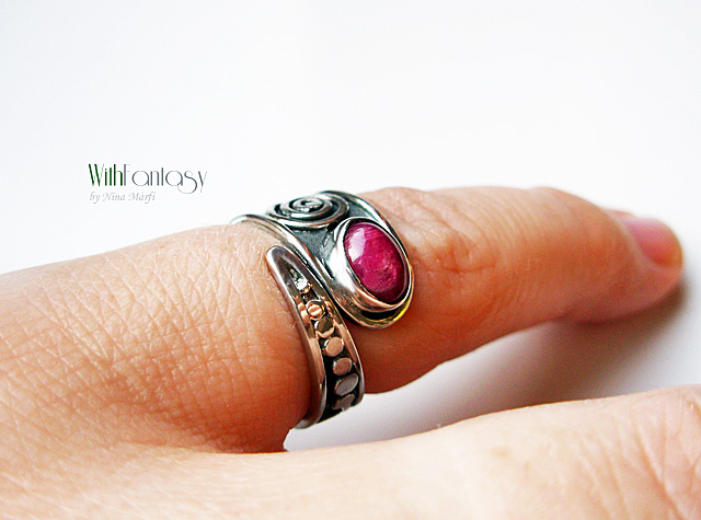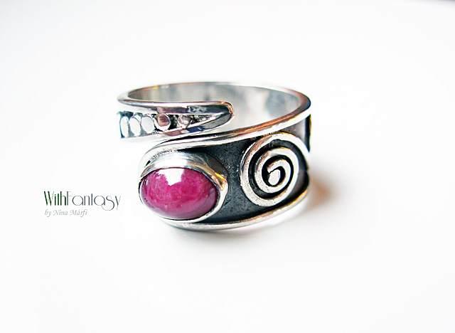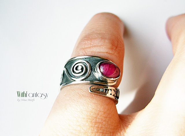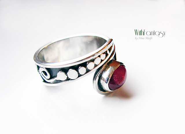 Egyedi, ezüst gyűrű rubin kabosonnal. A gyűrű kézzel készült, oxidált és polírozott.