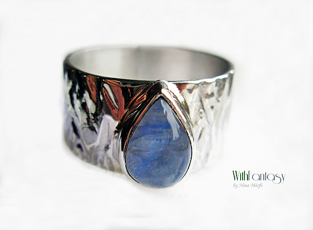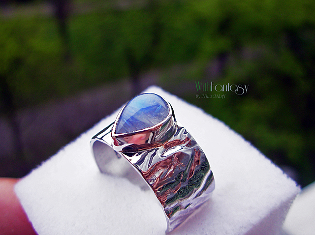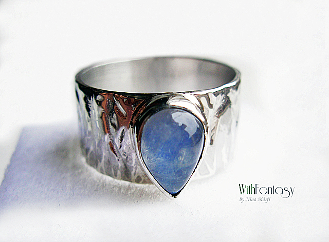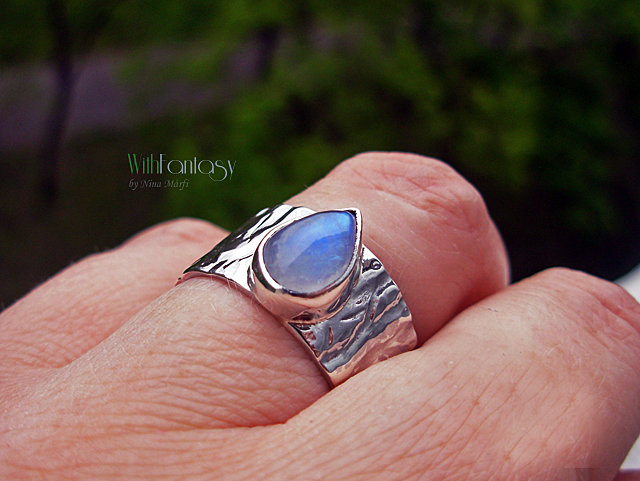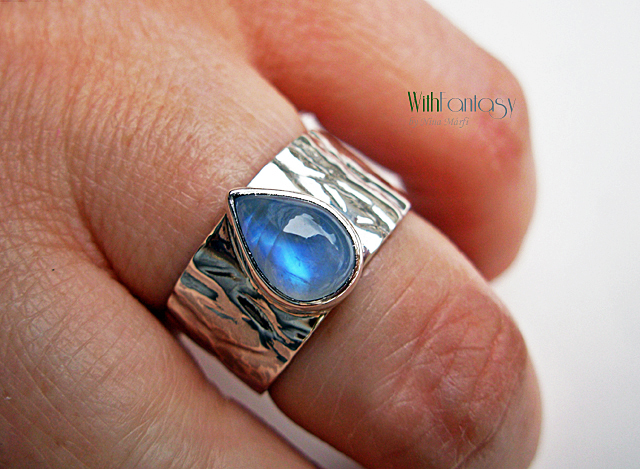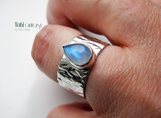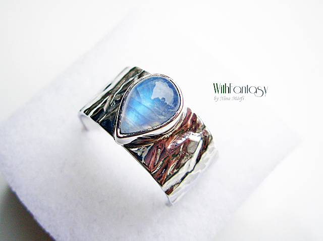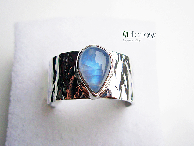 Egyedi, nagyon érdekes, ezüst gyűrű gyönyörű holdkővel. A gyűrű teljesen kézzel készült és polírozott. A kő nagyon szép, erős kék fénnyel ragyog.