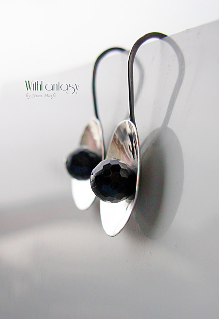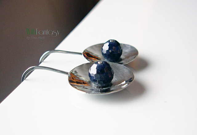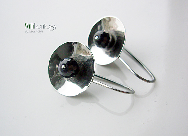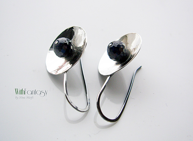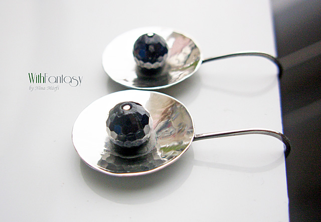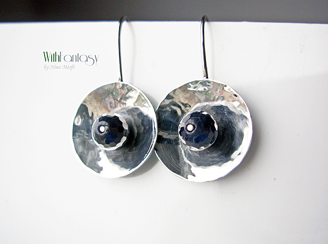 Egyedi, egyszerű fülbevaló, kézzel készült ezüstből és sötét zafírral.
