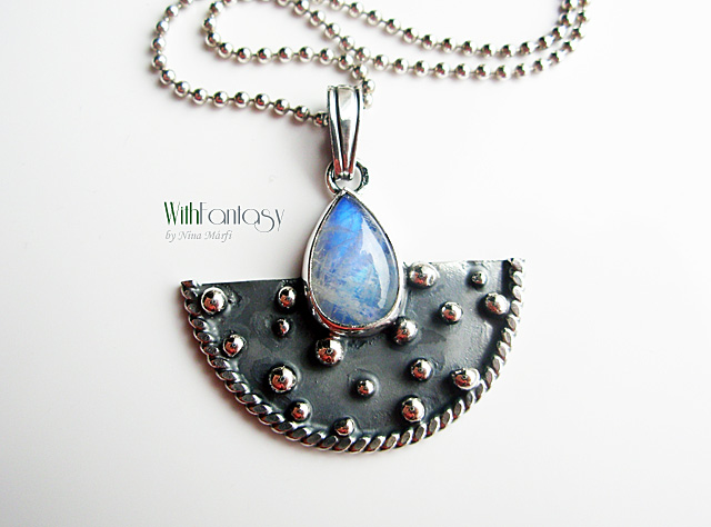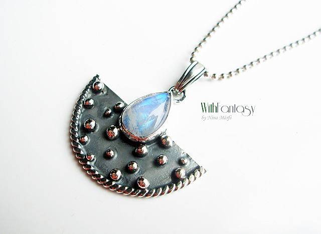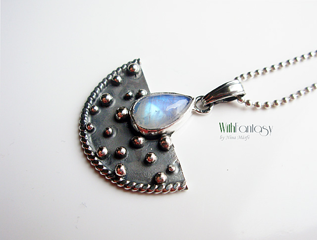 Egyedi, ezüst medál holdkővel, kézzel készült, oxidált és polírozott. Rendélésre készült.