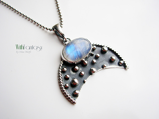 Egyedi, ezüst medal gyönyörű holdkővel, kézzel készült, oxidált és polírozott.