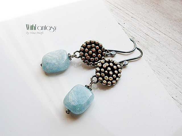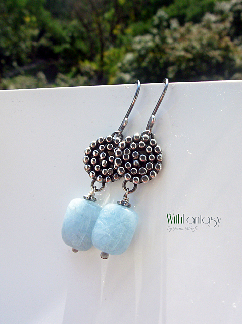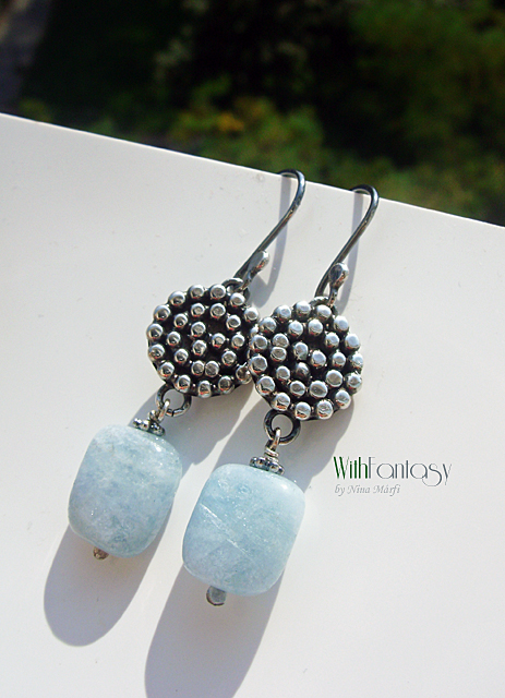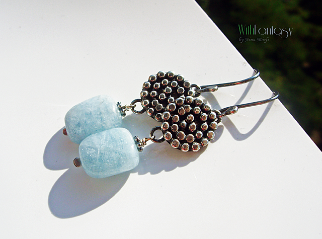 Egyedi, kézzel készült, ezüst fülvevaló gyönyörű akvamarinnal. Az ezüst oxidált és polírozott.