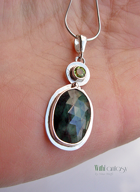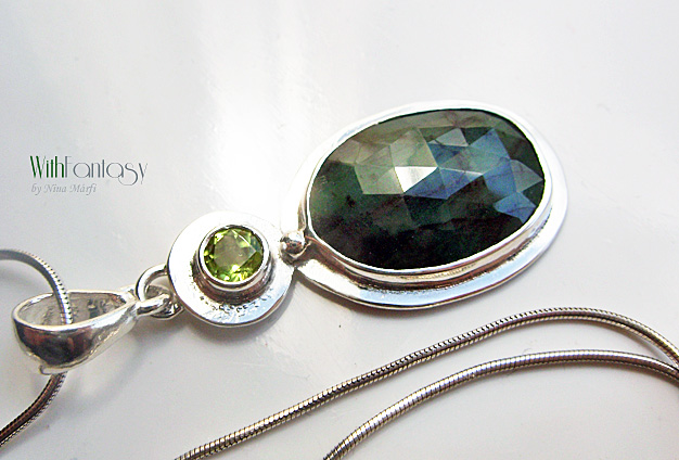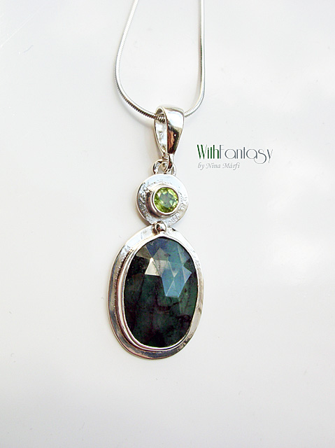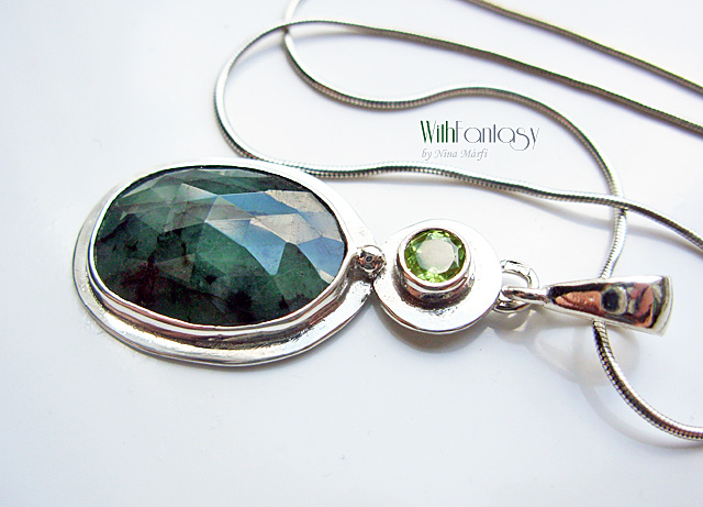 Egyedi, elegáns medál kézzel készült ezüstből, gyönyörű smaragddal és kis peridottal. Az ezüst fehér, kérésre oxidálom.