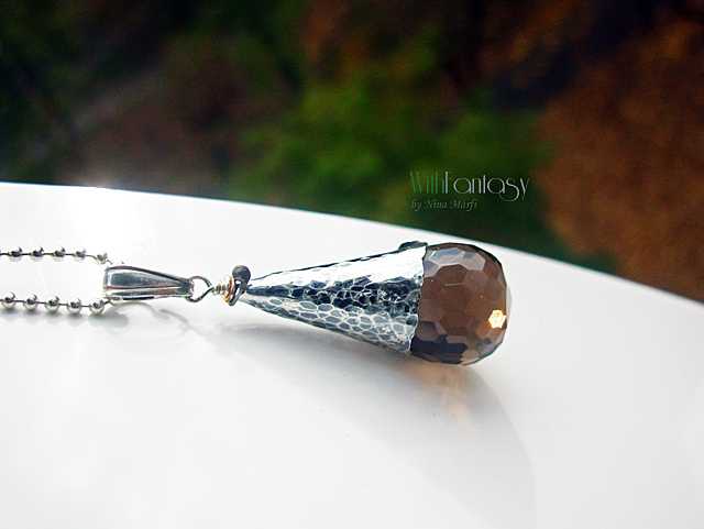 Egyedi, ezüst medál nagy füst kvarc cseppel. Az ezüst oxidált, texturált és polírozott.