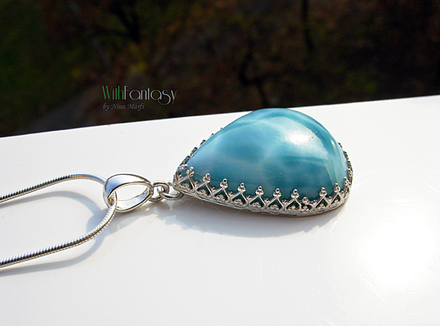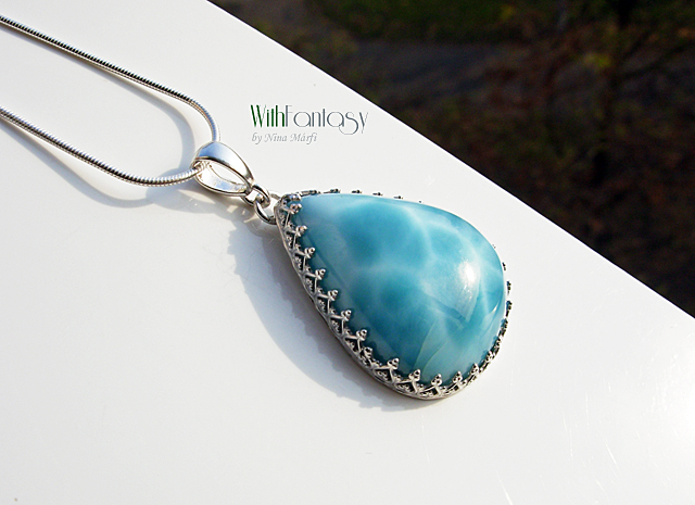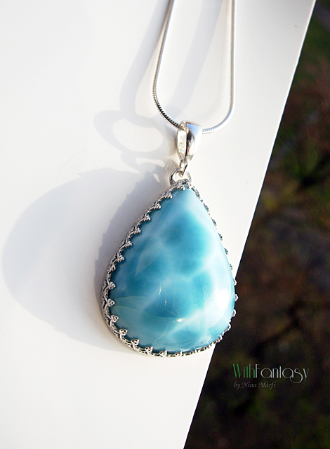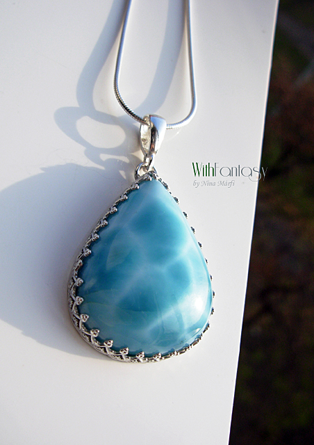 Egyedi, romantikus, ezüst medál különleges, gyönyörű, nagy larimar kabosonnal, a kő elsőosztájú.