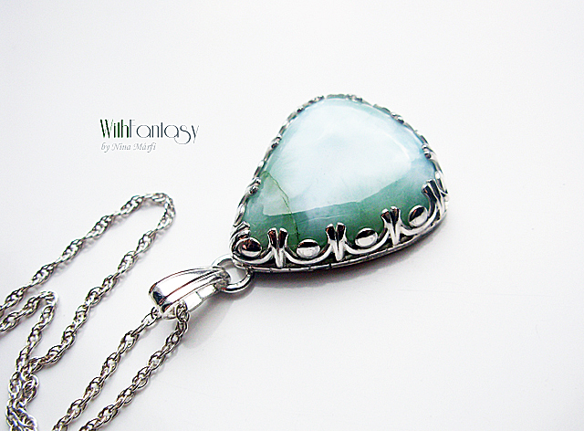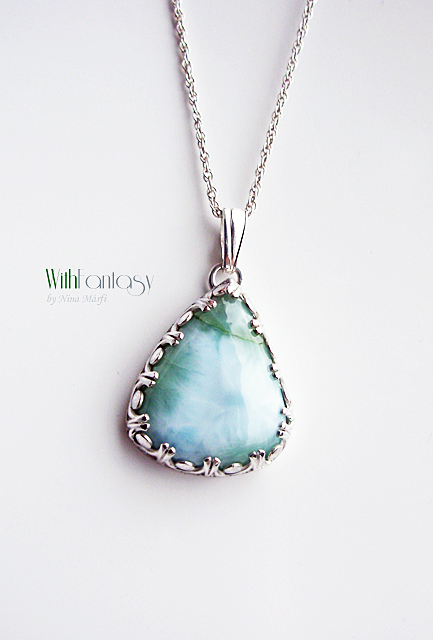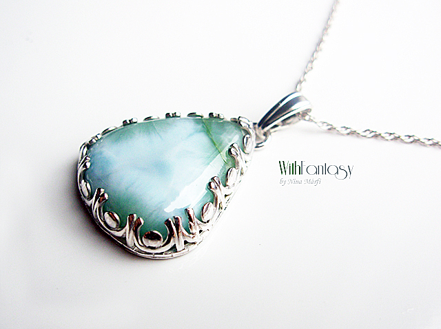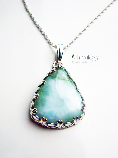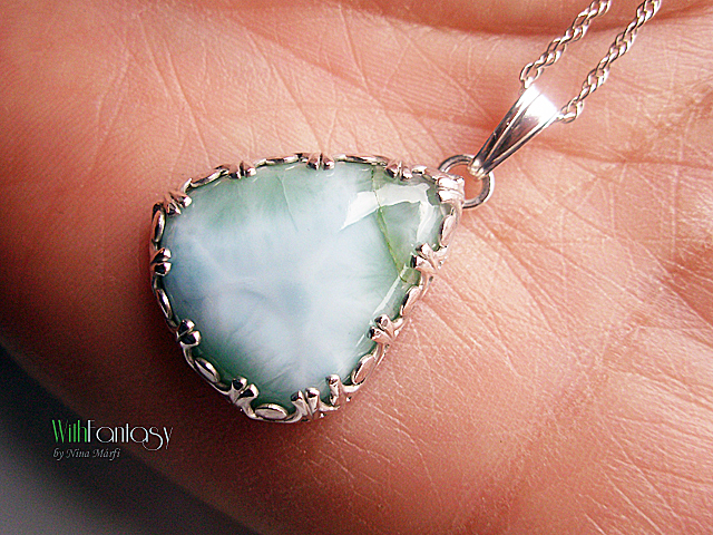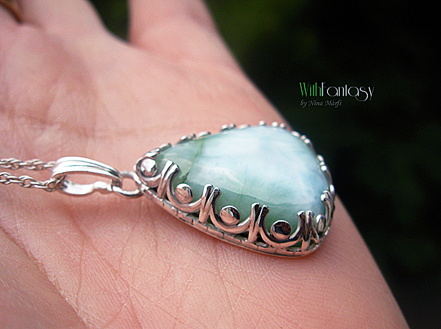 Romantikus, ezüst medál gyönyörű larimarral. A kő különleges, tiszta, világos kék színű. Az ezüst polírozott.