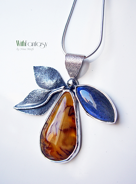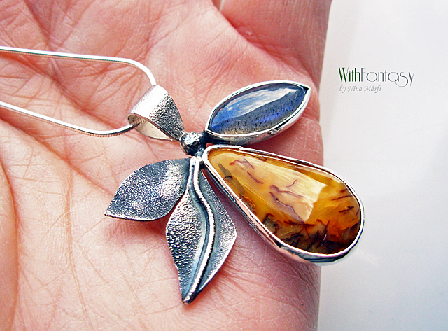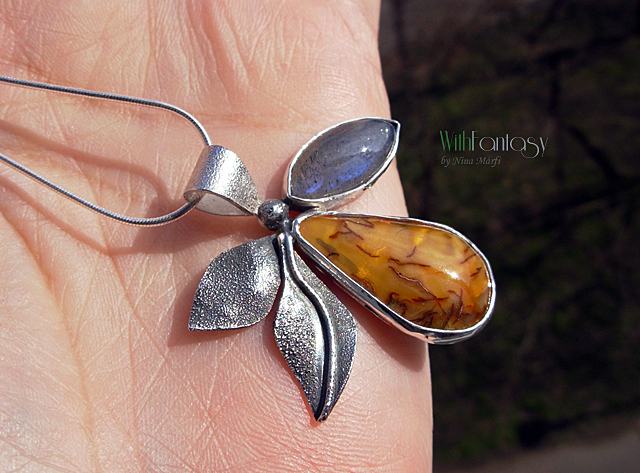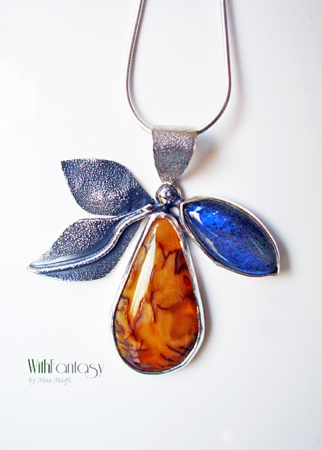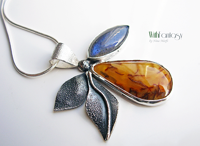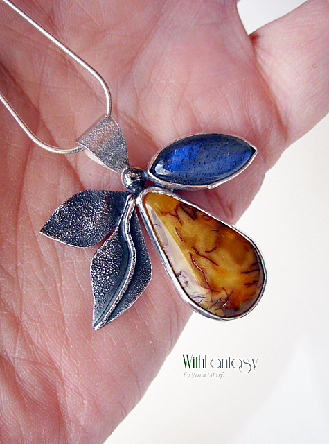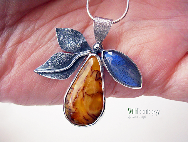 Egyedi, különleges, ezüst medál érdekes, napos borostyánnal és labradorittal, a labradori nagyon jó minőségű, erős kék fénnyel ragyog. Az ezüst részben texturált és oxidált.