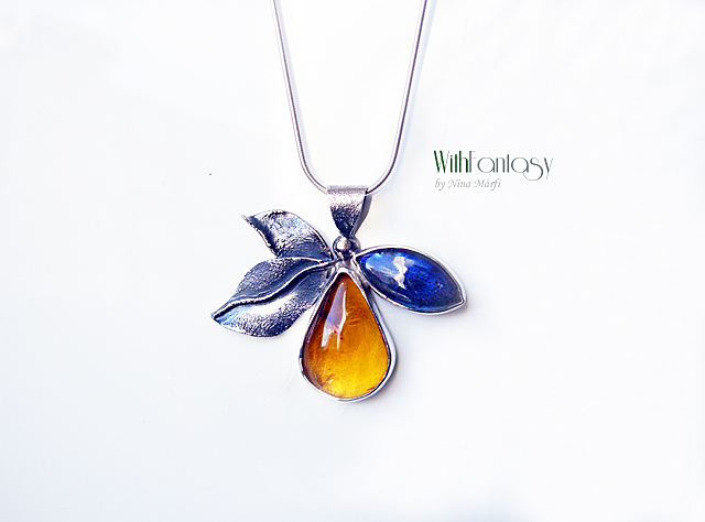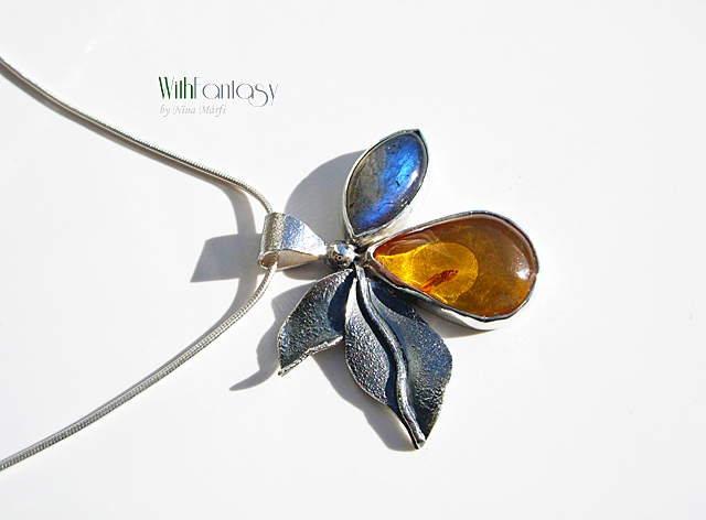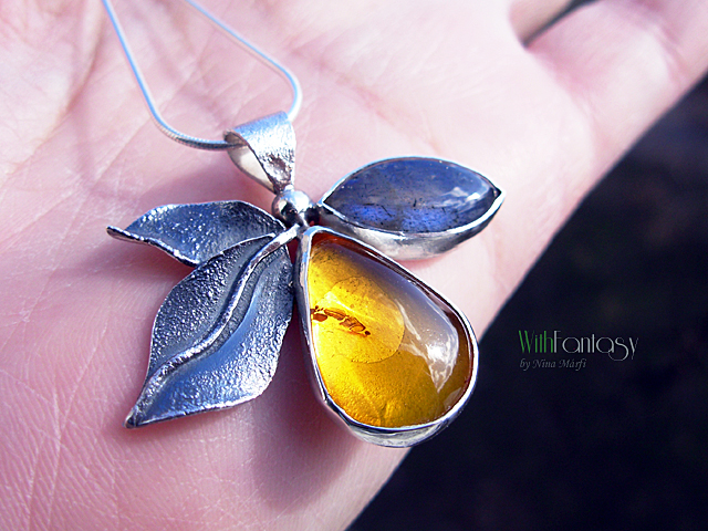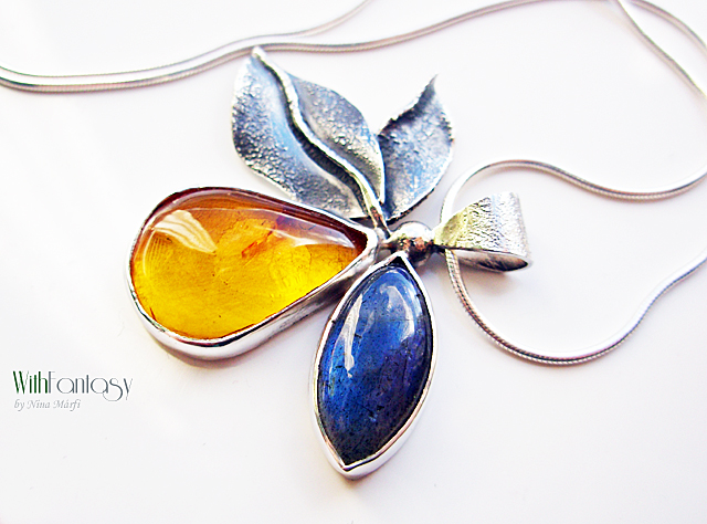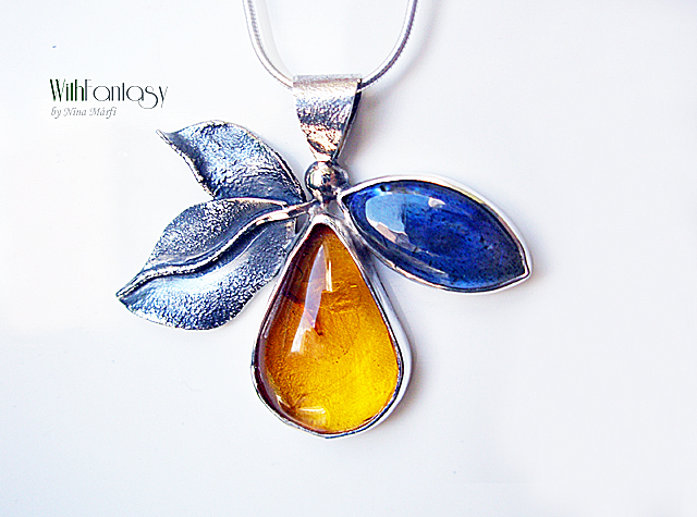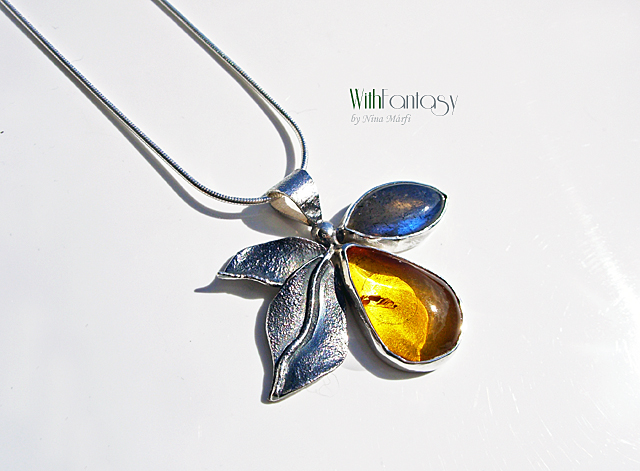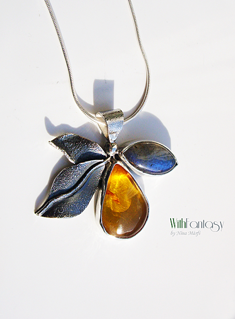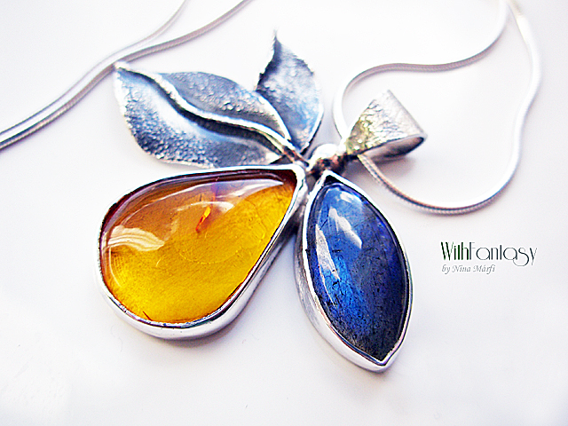 Egyedi, különleges, ezüst medál világos, napos borostyánnal és labradorittal, a labradori nagyon jó minőségű, erős kék fénnyel ragyog. Az ezüst részben texturált és oxidált.
