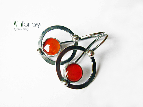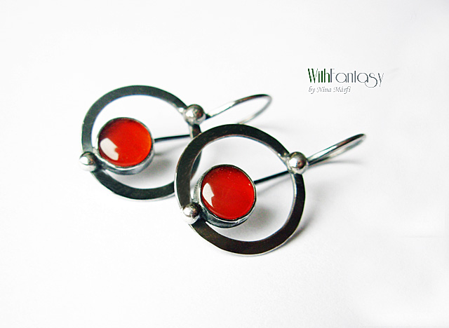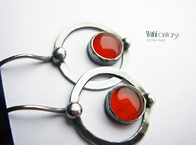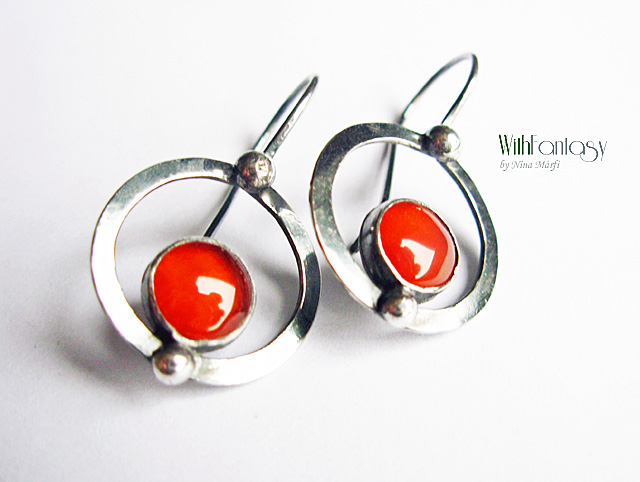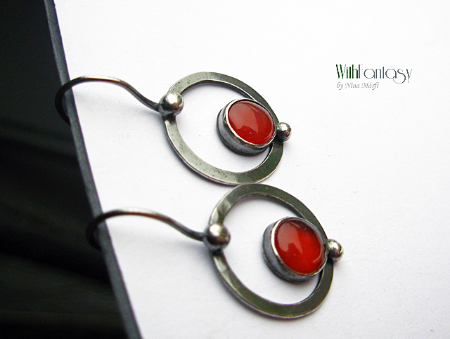 Egyedi, teljesen kézzel készült, ezüst fülbevaló karneol labosonnal. A fülbevaló egyszerű, elegáns formajú. Az ezüst erősen oxidált és polírozott.
