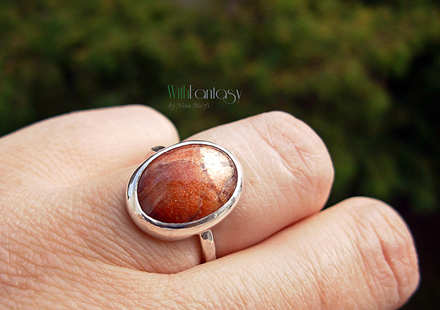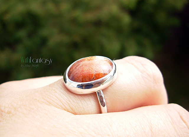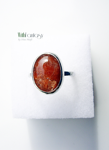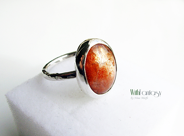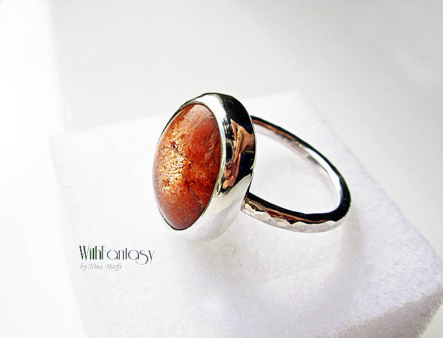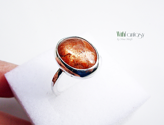 Egyszerű, klasszikus ezüst gyűrű gyönyörű ovális napkővel. Az ezüst fehér, polírozott.