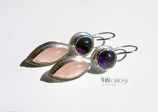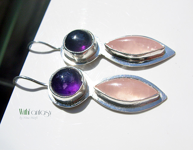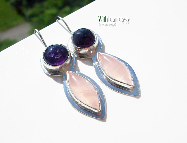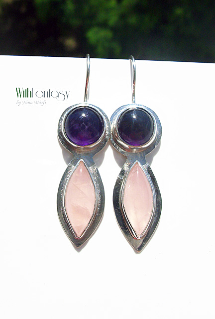 Egyedi, ezüst fülbevaló rózsakvarccal és ametiszttel. Az ezüst fehér, polírozott.