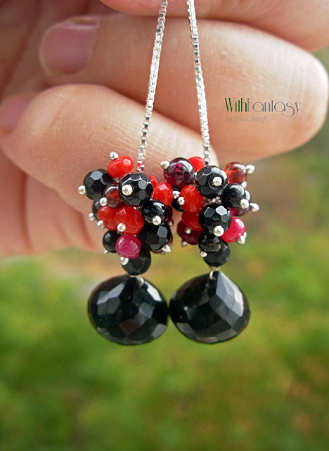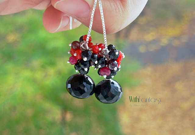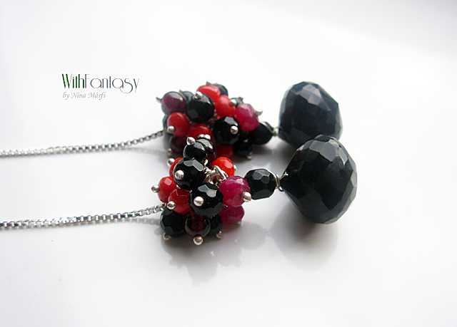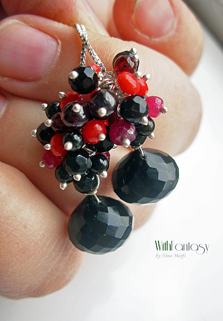 Elegáns, fürtös fülbevaló fekete spinellel, ónix-szel, piros korallal, gránáttal és málna színű rubinnal.