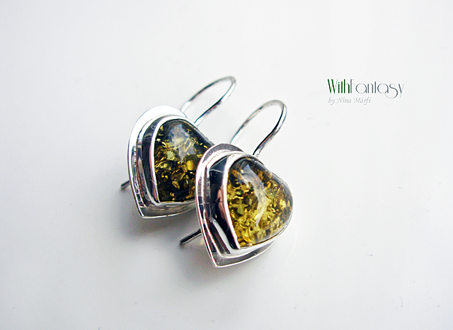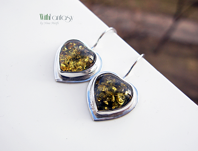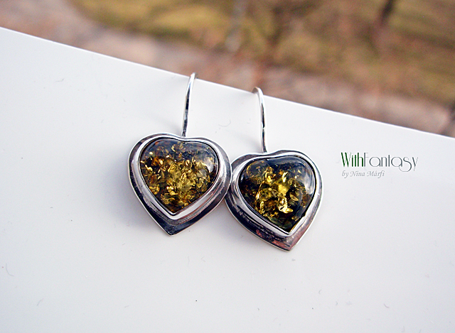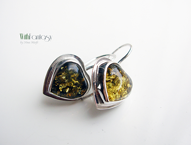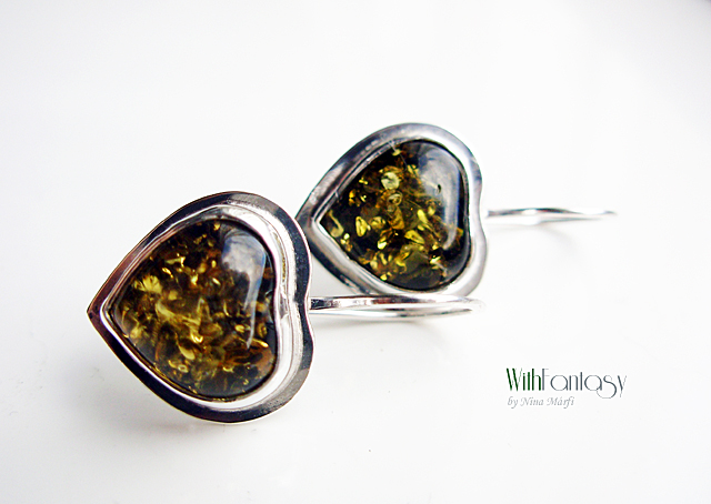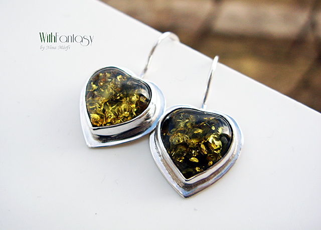Vidám, érdekes, ezüst fülbevaló gyönyörű, optimista zöld borostyán szívecskékkel. Az ezüst fehét, polirozott.