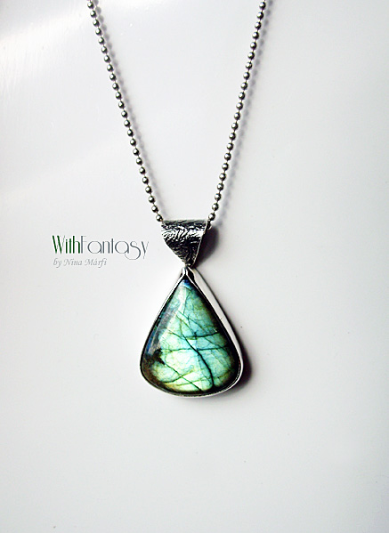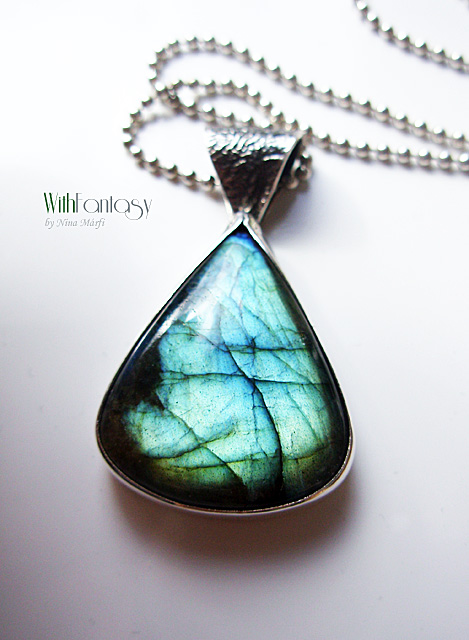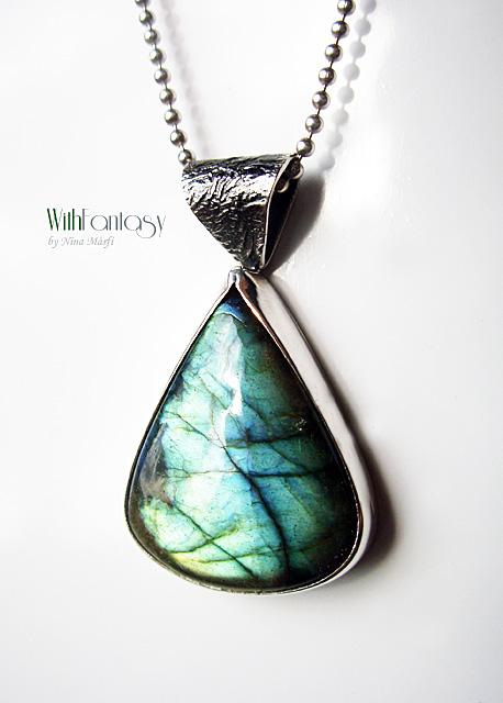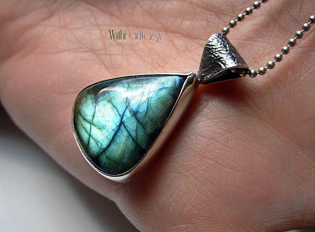 Egyedi, egyszerű, ezüst medál gyönyörű labradorittal. A medál kézzel készült, részben oxidált és polírozott. A kő nagyon jó minőségű, kék és arany fénnyel ragyog.