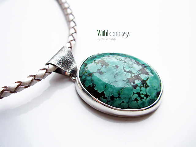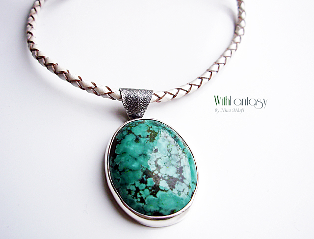 Érdekes, ezüst medál gyönyörű tibeti türkizzel és gyöngy színű bőrszíjjal Az ezüst fehér és polírozott.