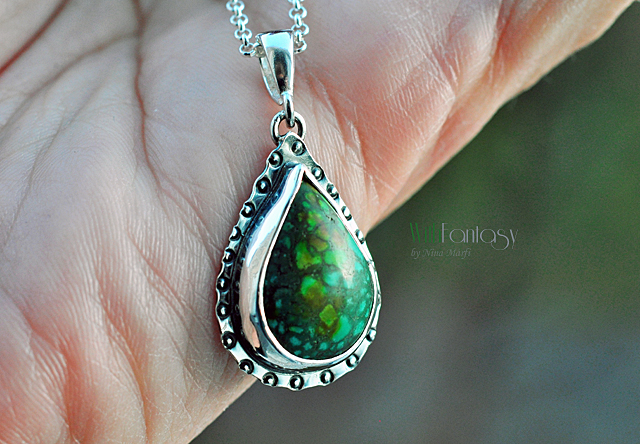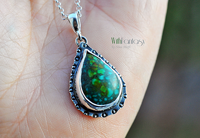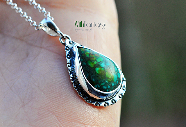 Érdekes, romantikus, ezüst medál gyönyörű tibeti türkizzel. A kő nagyon jó minőségű, gyönyörű,;rdekes. Az ezüst oxidált és polírozott.