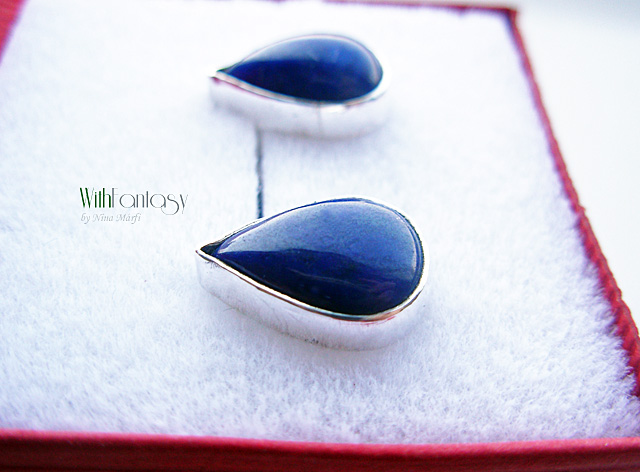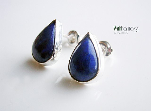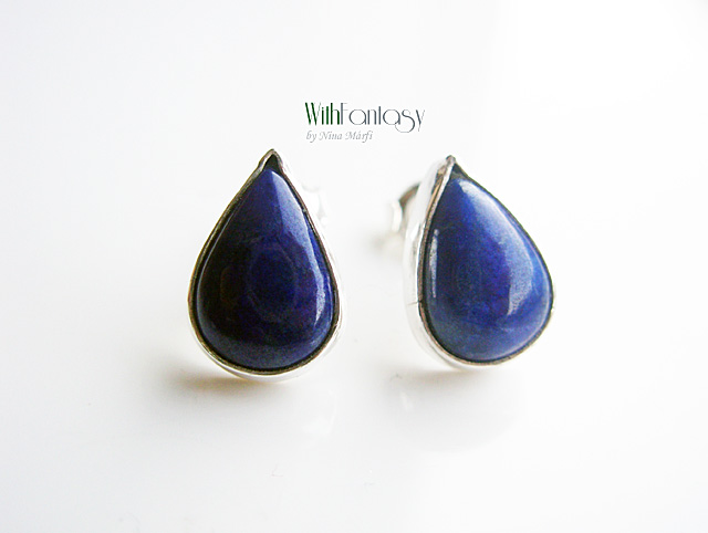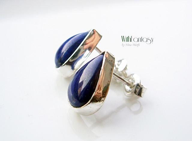 Kis, bedugós fülbevaló kézzel készült ezüstből és lápisz kabosonokból. A kövek nagyon jó minőségűek, tiszta, intenzív kék színű.