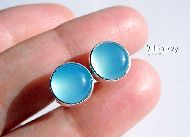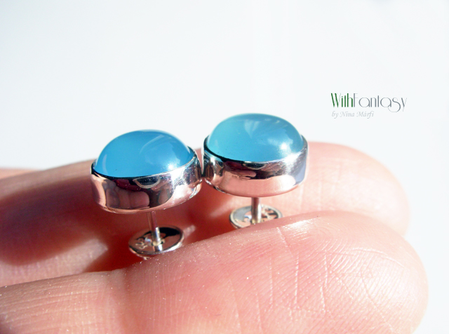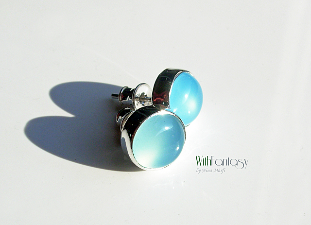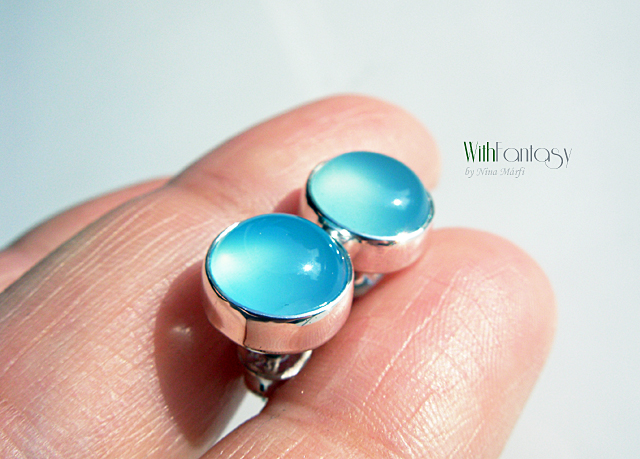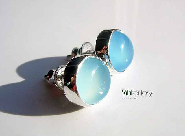 Klasszikus, univerzális, bedugós, ezüst fülbevaló világos kékkalcedonnal . A kövek nagyon jó minőségűek, tiszta, fris színű. Az ezüst fehér és polírozott.