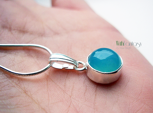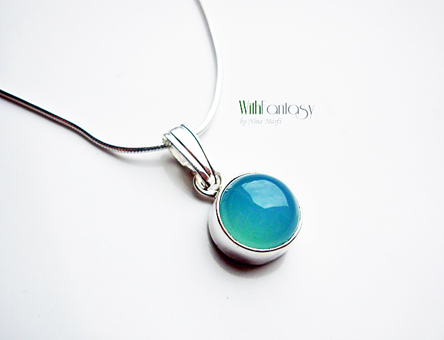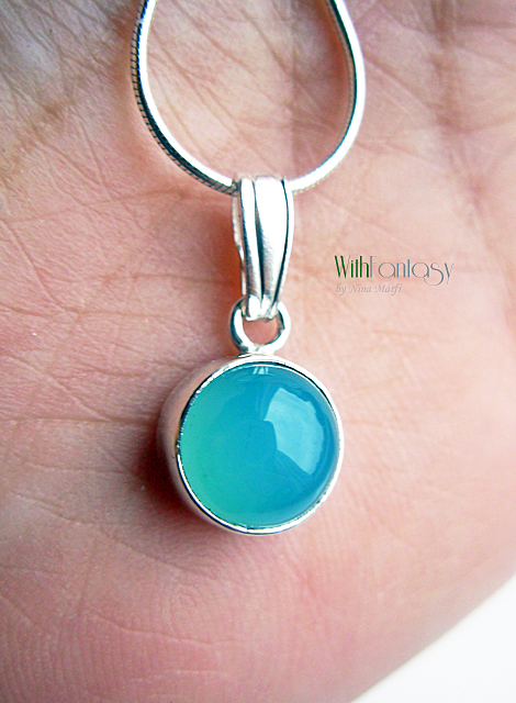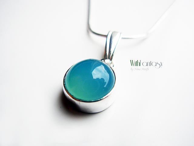 Kis, finom medál világos kék kalcedonnal. Az ezüst fehér, polírozott.
