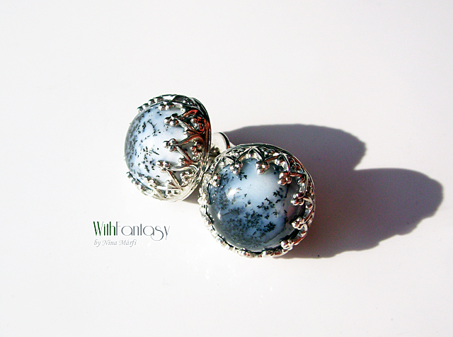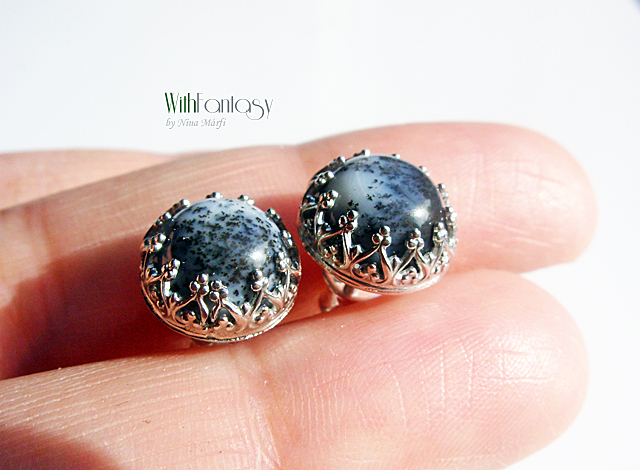 Klasszikus, univerzális, bedugós, ezüst fülbevaló denndrites acháttal . A kövek nagyon jó minőségűek, érdekesek . Az ezüst fehér és polírozott.