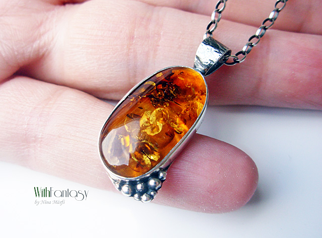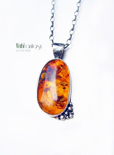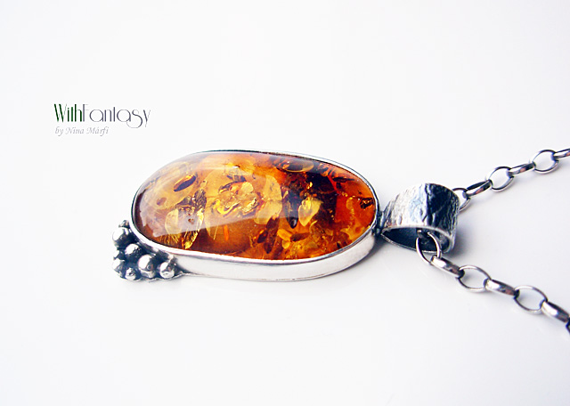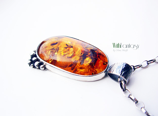 Egyedi ezüst medál gyönyörű, érdekes borostyánnal. A medál kézzel készült, oxidált, polírozott.
