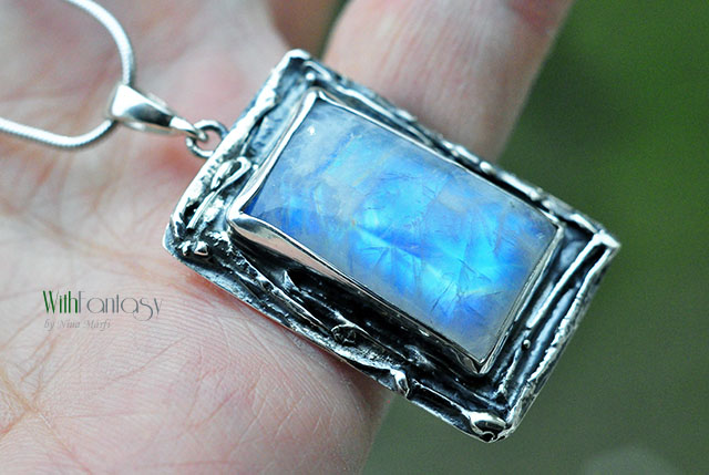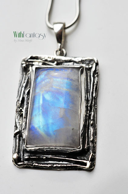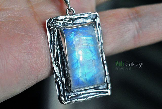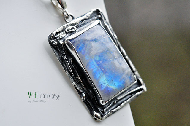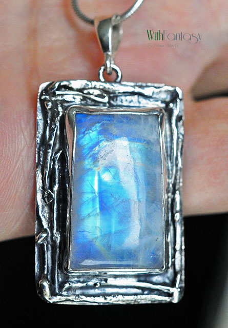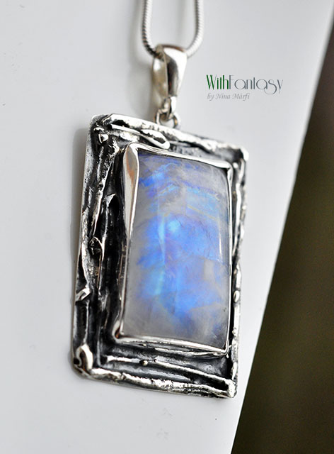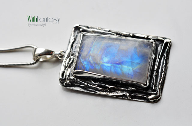 Egyedi, finom, érdekes, ezüst medál gyönyörű holdkő kabosonnal, a kő első osztályú, tiszta, erős kék fénnyel ragyog.