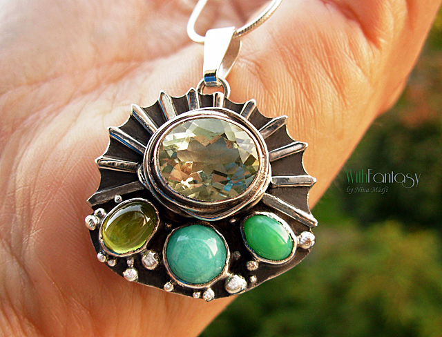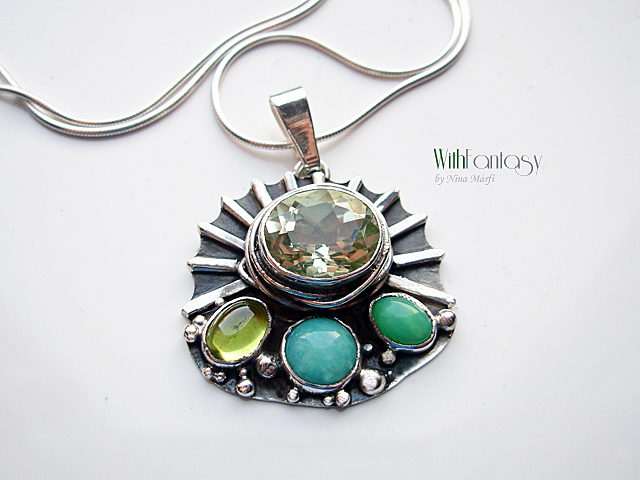 Egyedi, nagyon érdekes ezüst medál-amulett aminek egy kicsi tengeri és mesebeli hangulatot adtam. A medál közepén egy gyönyörű, nagy, világos zöld, átlátszó prasiolite (zöld ametiszt) található és alatta amazonit, krizopráz és peridot. Az ezüst oxidált és polírozott. A medál teljesen kézzel készült.