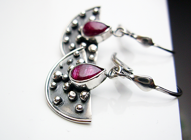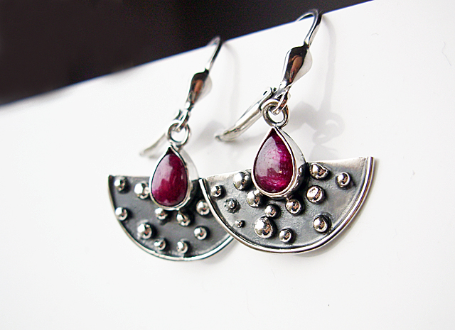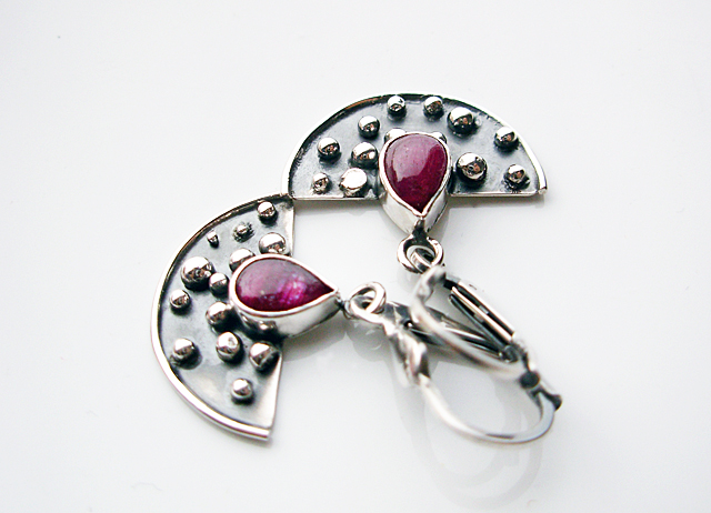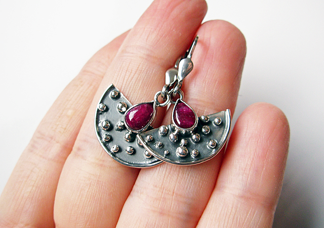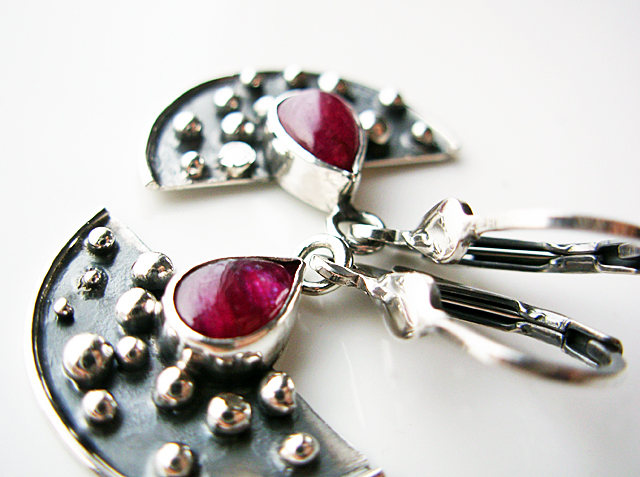 Egyedi, érdekes ezüst fülbevaló kis rubin cseppekkel. A fülbevaló kézzel készült, oxidált és polírozott.