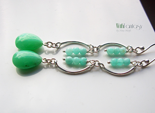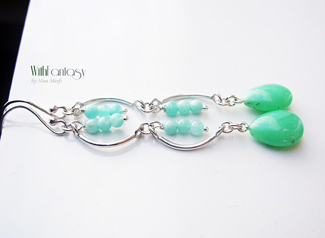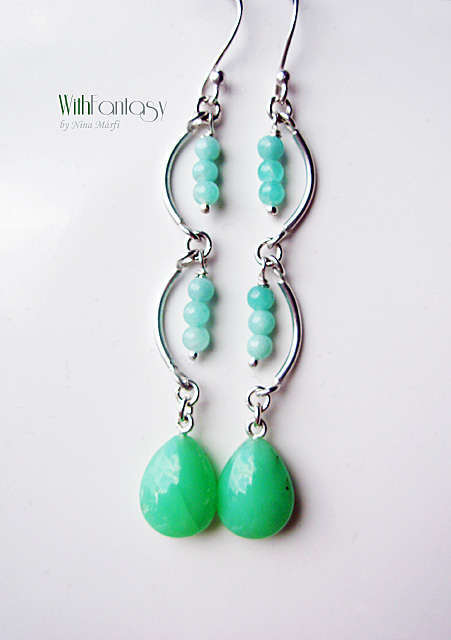 Rendelésre készült, hosszú, ezüst fülbevaló gyönyörű krizoprazzal és amazonittal.