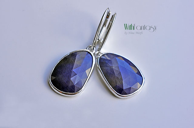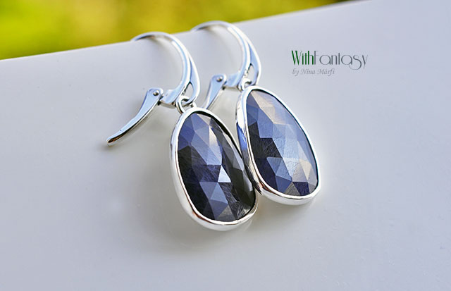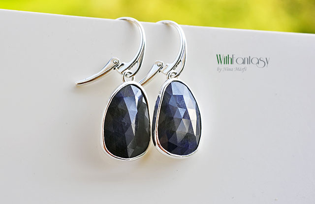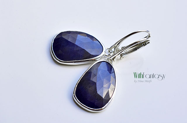 Egyedi, ezüst, kézzel készült fülbevaló gyönyörű, nagy, érdekes zafírral. A kövek sötét kékek, erősen ragyognak. Az ezüst fehér és polírozott.