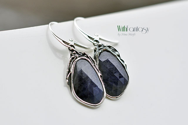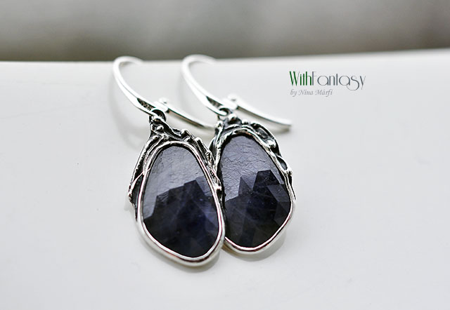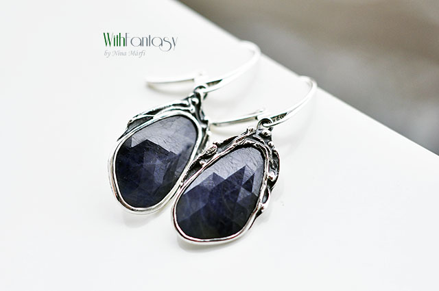 Egyedi, ezüst, kézzel készült fülbevaló gyönyörű, nagy, érdekes zafírral. A kövek sötét kékek, erősen ragyognak. Az ezüst részben texturált, oxidált és polírozott.
