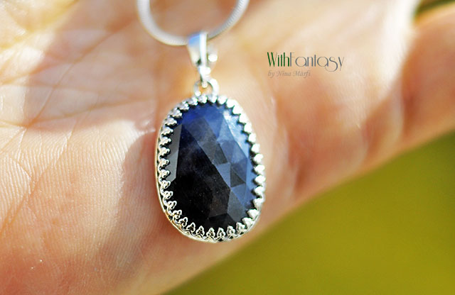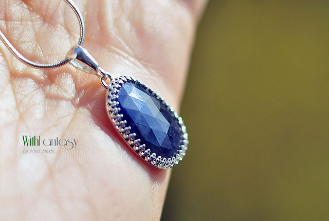 Egyedi, ezüst, kézzel készült medál gyönyörű, nagy, érdekes zafírral. A kő sötét kék, erősen ragyog. Az ezüst fehér és polírozott.