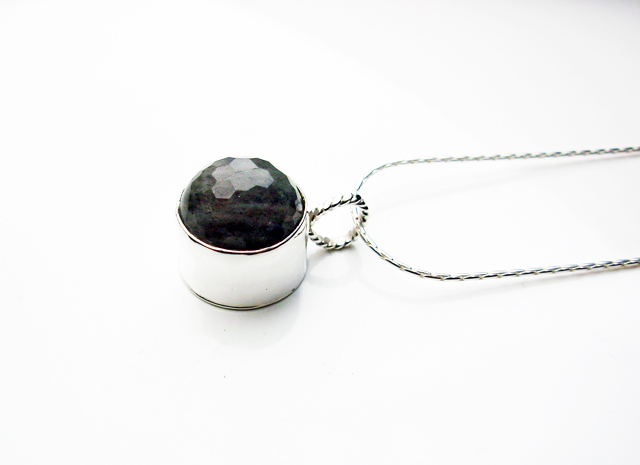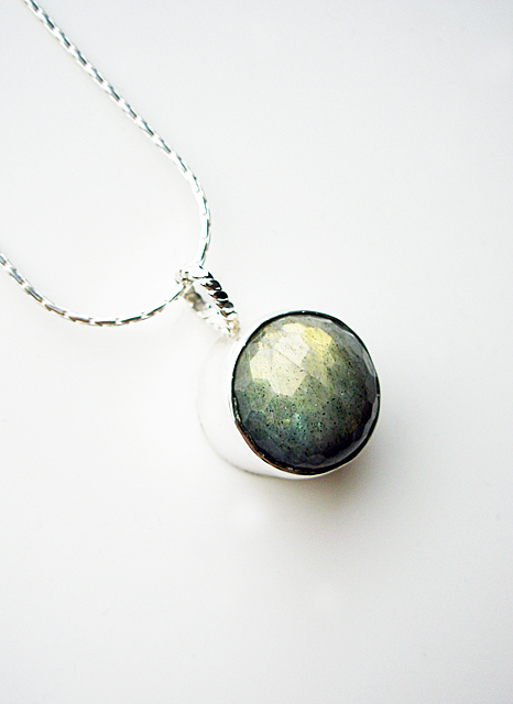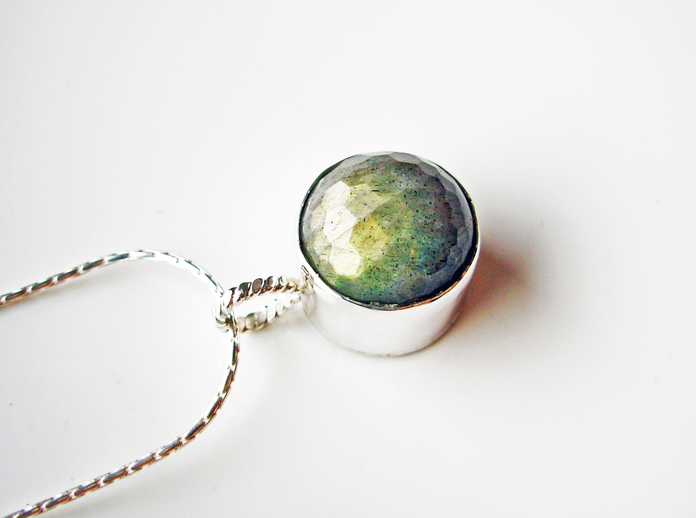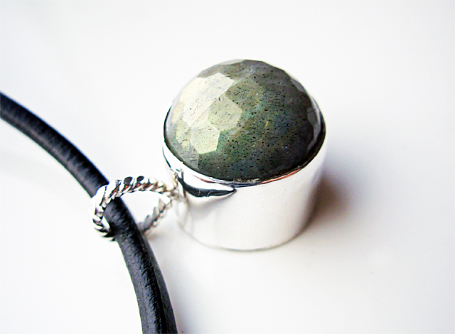 Egyszerű, egyedi ezüst medál labradorittal. A kő arany fénnyel ragyog. A medál kézzel készült és polírozott.