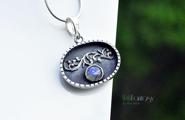 Delikatny, stonowany naszyjnik wykonany ze srebra 925, unikatowego agatu dendrytowego z filigranową, botaniczną inkluzją i z labradorytem po drugiej stronie, którego klasyczną szarość przełamuje lekko niebieski pobłysk. Srebro oksydowane i polerowane.