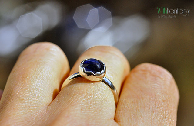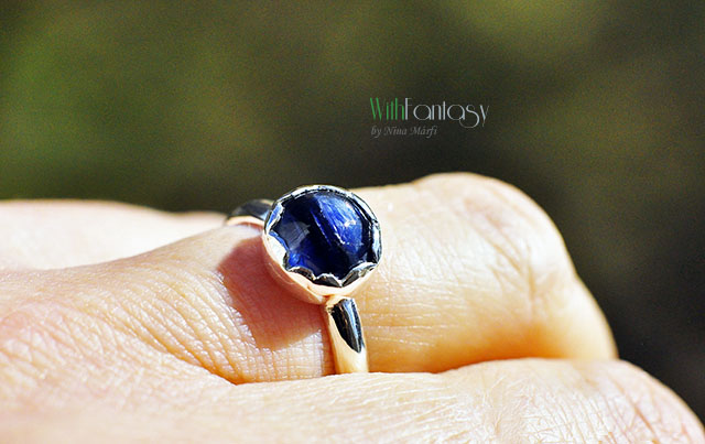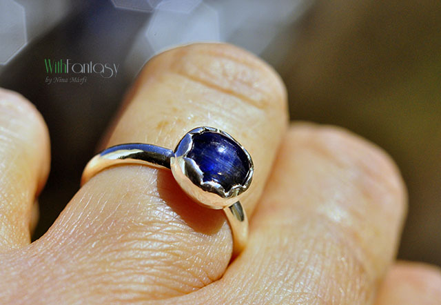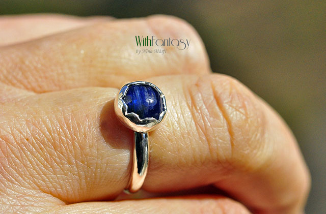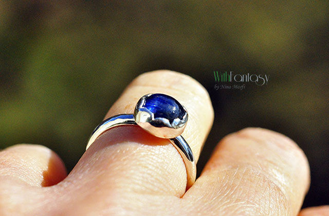 Drobny, kobiecy pierścionek wykonany na zamówienie ze srebra próby 925 i naturalnego kianitu.