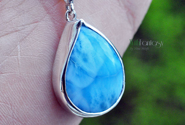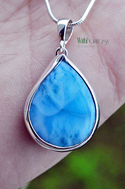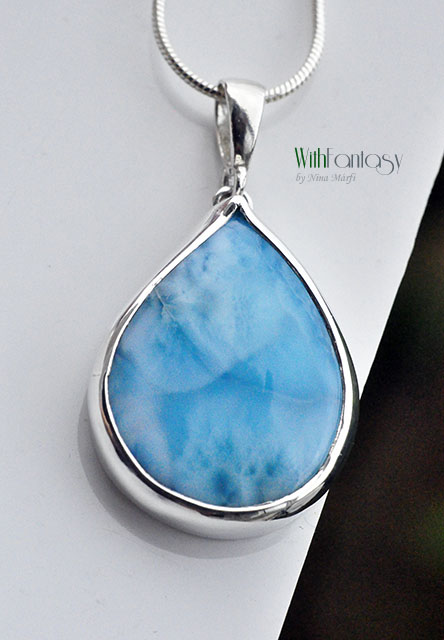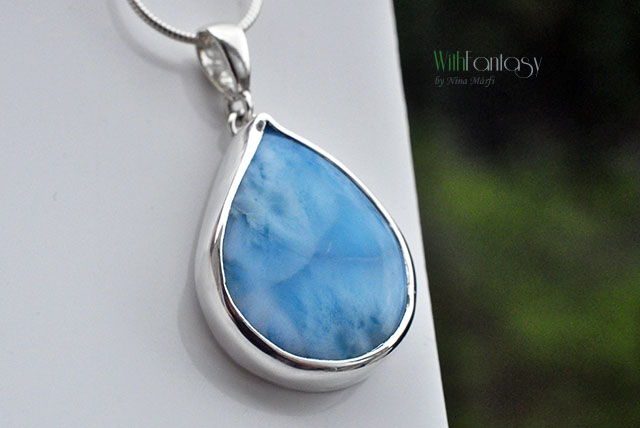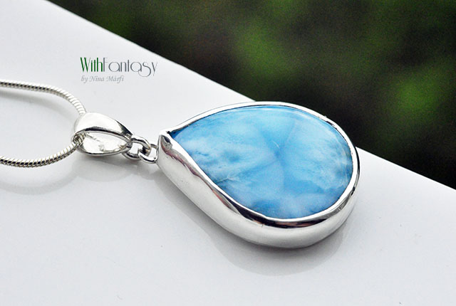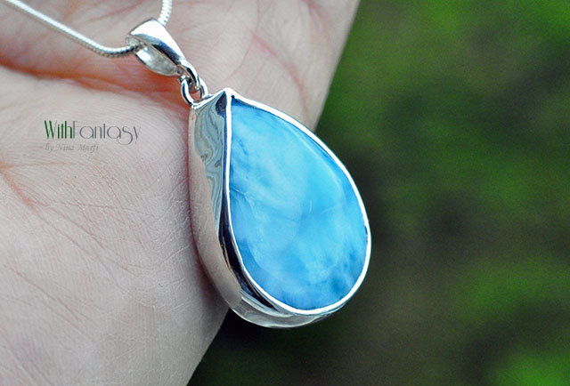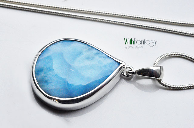 Minimalistyczny wisiorek z pięknym okazem naturalnego larimaru w kolorze laguny morskiej.