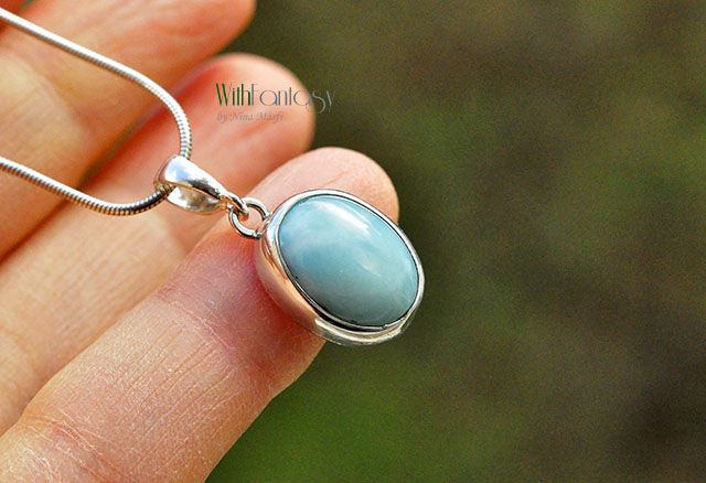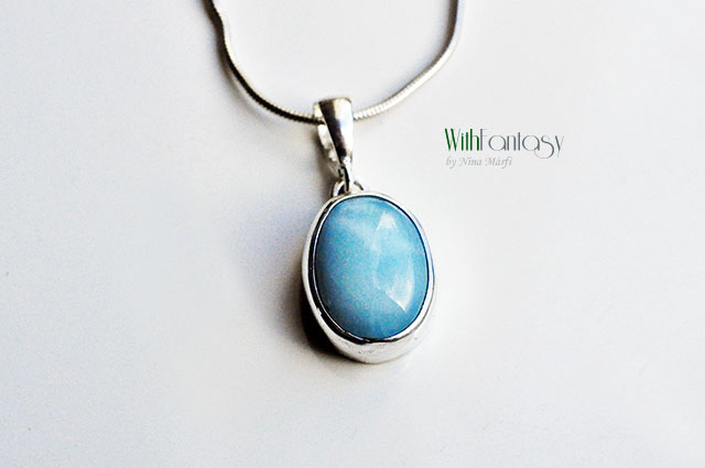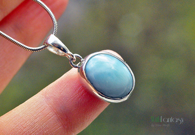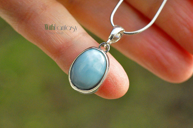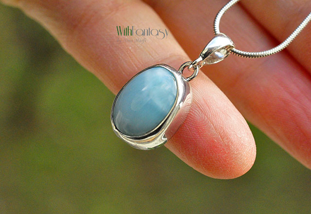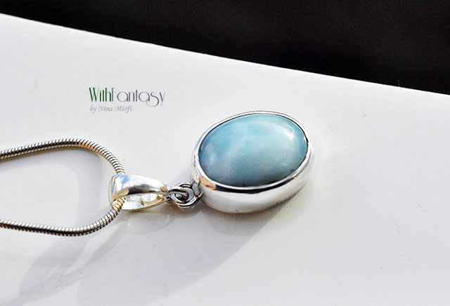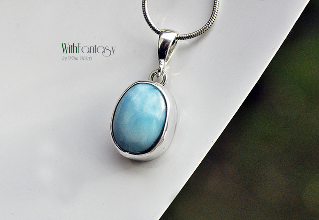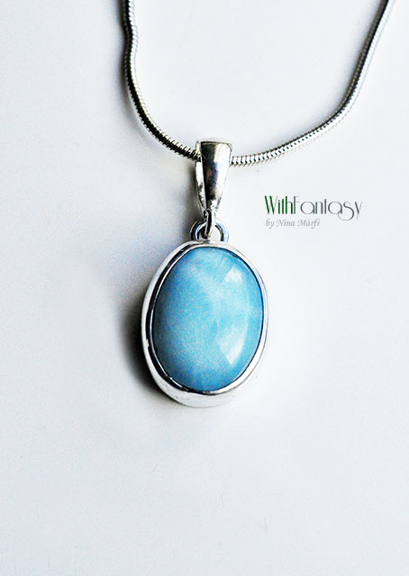 Minimalistyczny wisiorek z pięknym, czystym larimarem w kolorze błękitnego nieba zasnutego smugami chmur. Srebro próby 925, białe, polerowane.