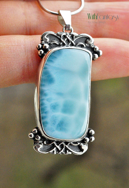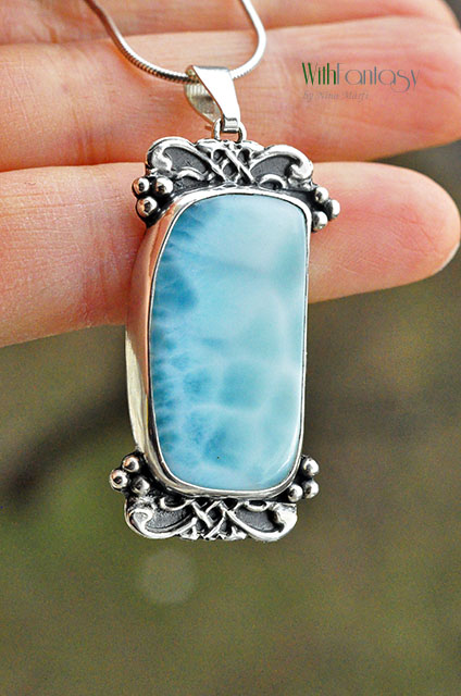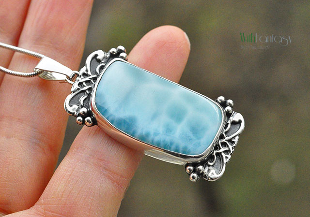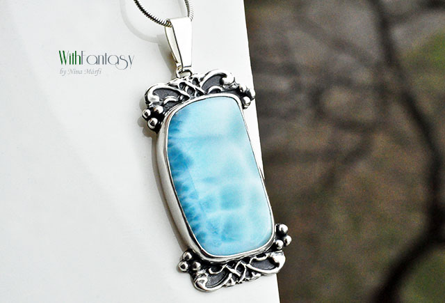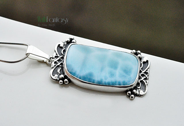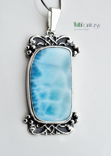 Bardzo oryginalny, ręcznie wykonany wisior z pięknym larimarem oprawionym w srebro próby 925, miejscowo oksydowane i polerowane.