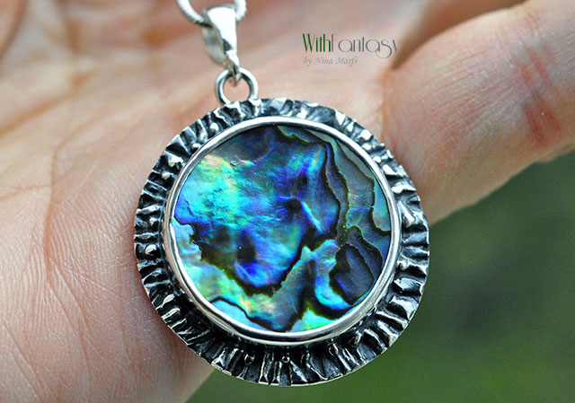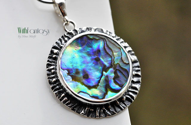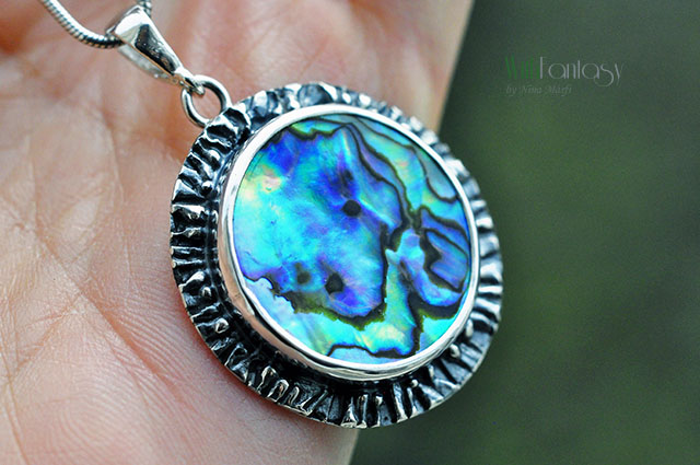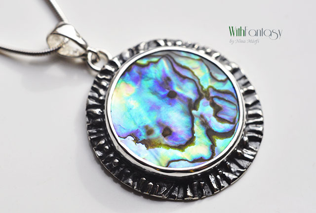 Srebrna awieszka z pięknym krążkiem muszli Paua. Użyte srebro nosi próbę 925.