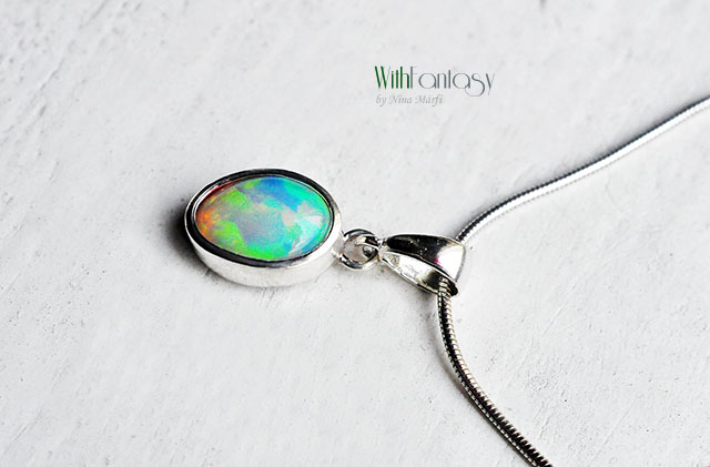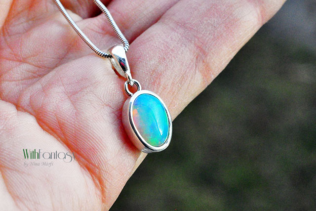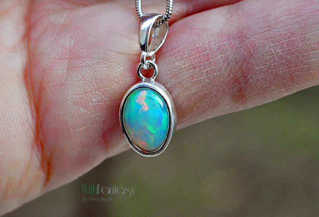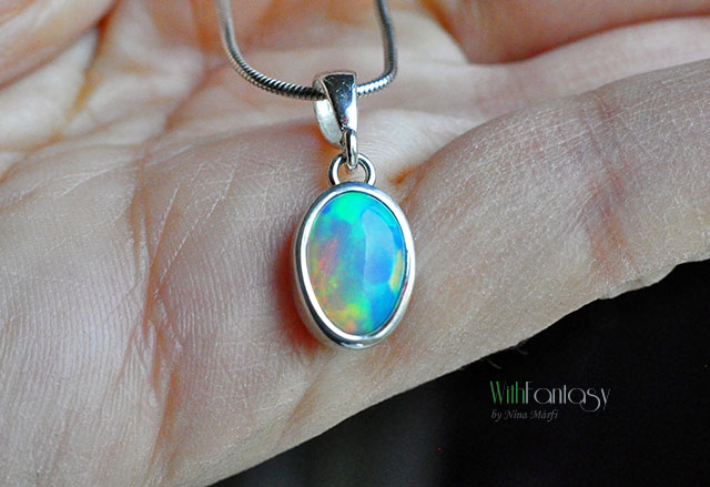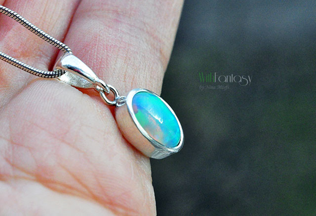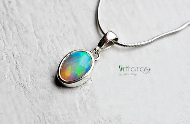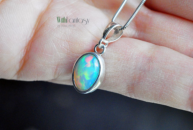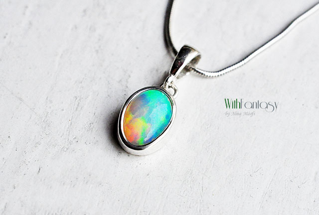 Delikatny, minimalistyczny wisiorek ze srebra proby 925 i pięknego, iskrzącego się wieloma kolorami opala etiopskiego. Srebro białe, polerowane.