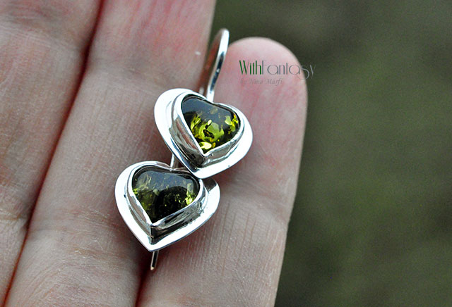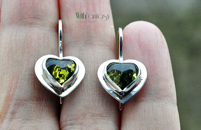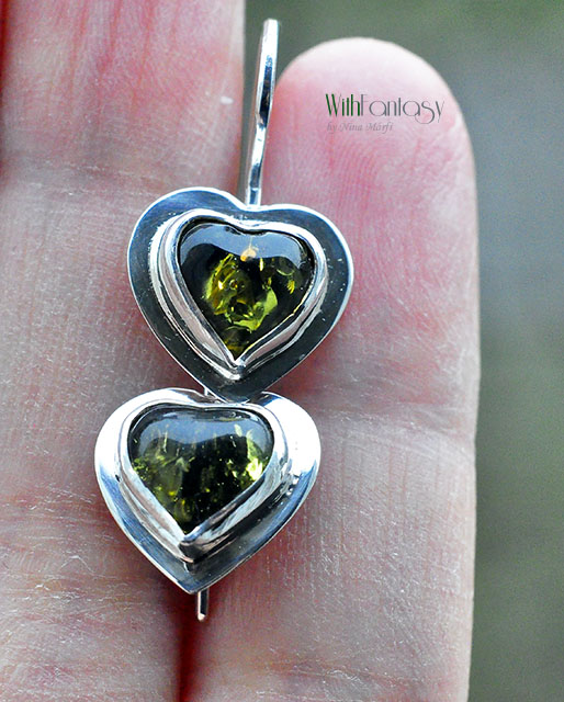 Radosne, optymistyczne, leciutkie kolczyki z serduszkami z zielonego bursztynu oprawionego w srebro próby 925