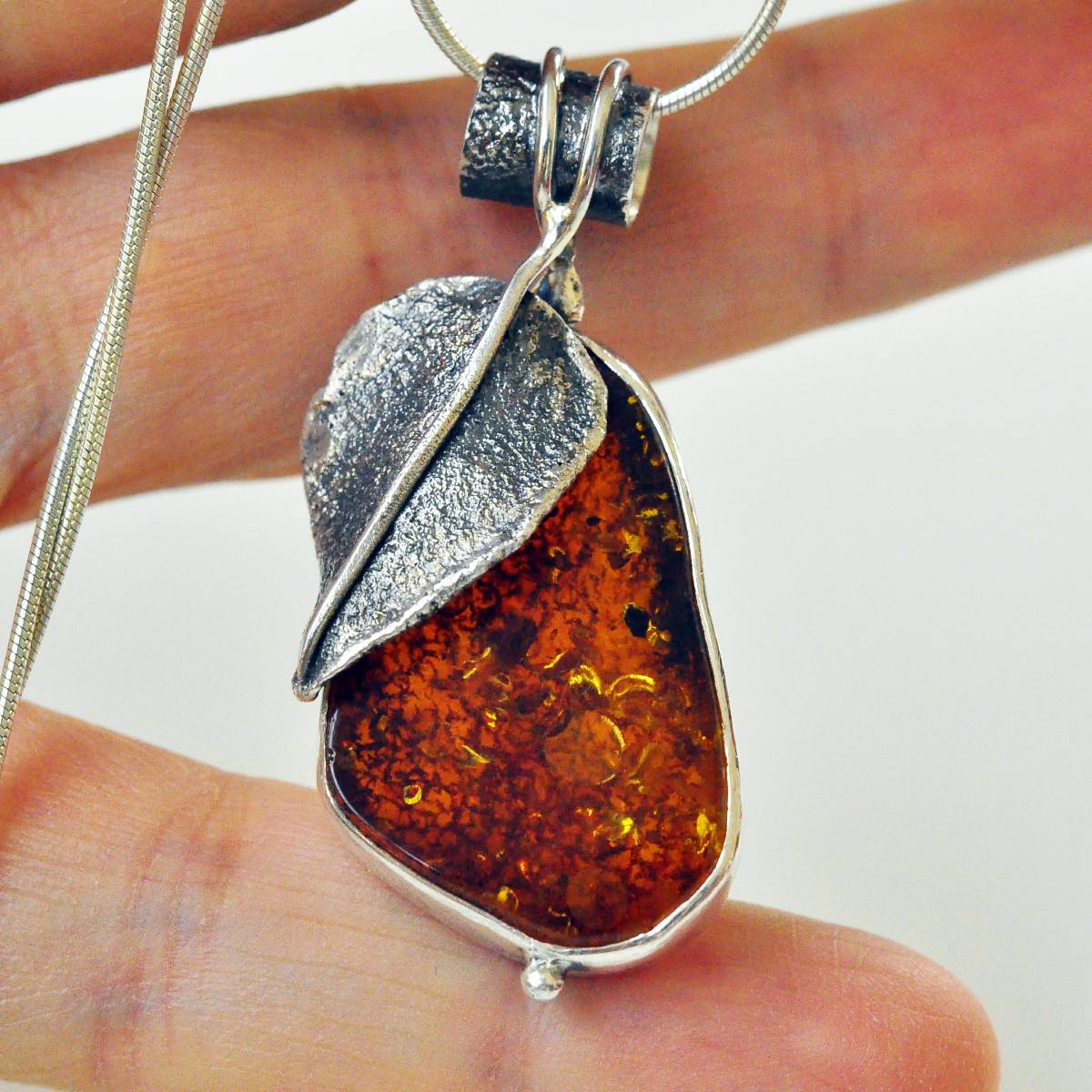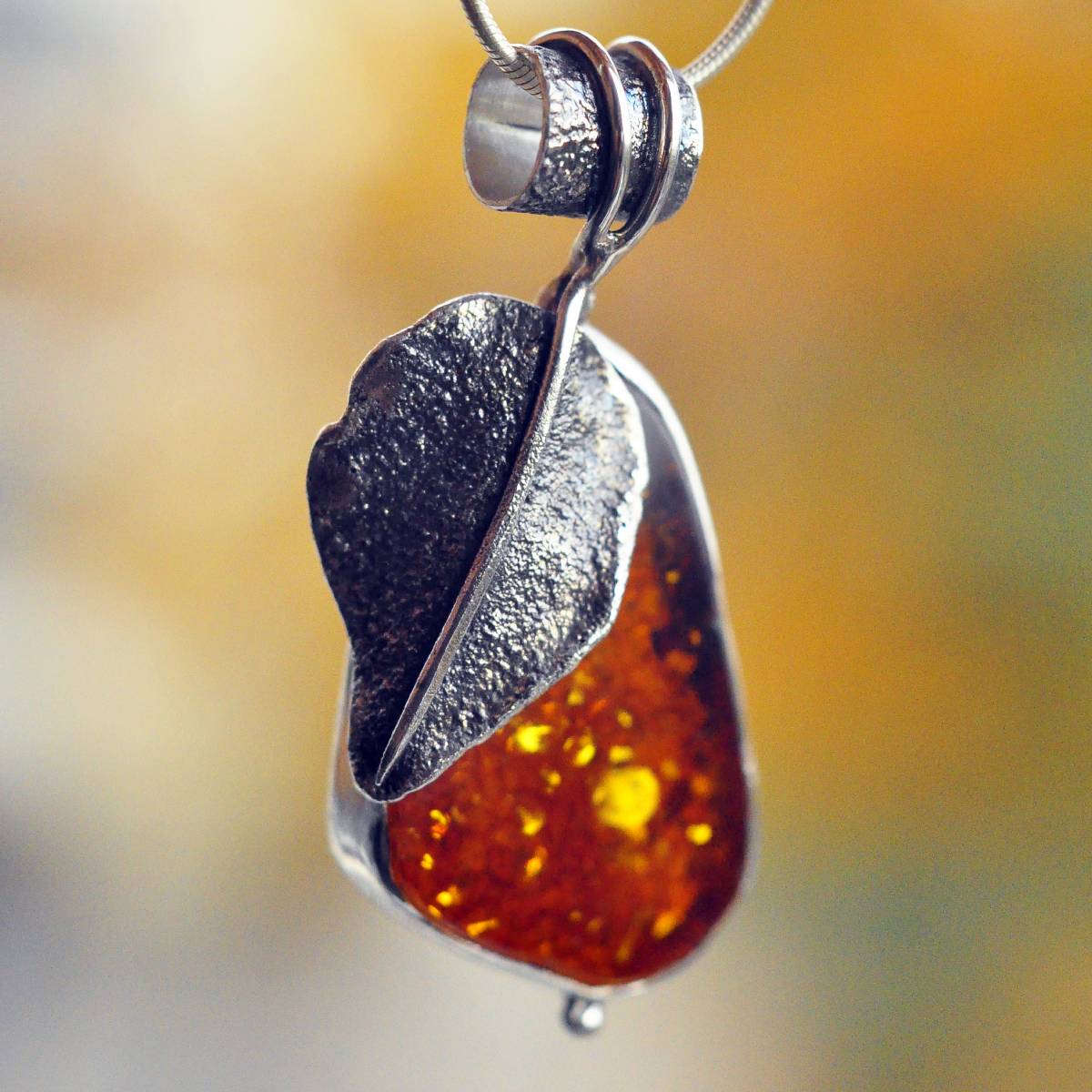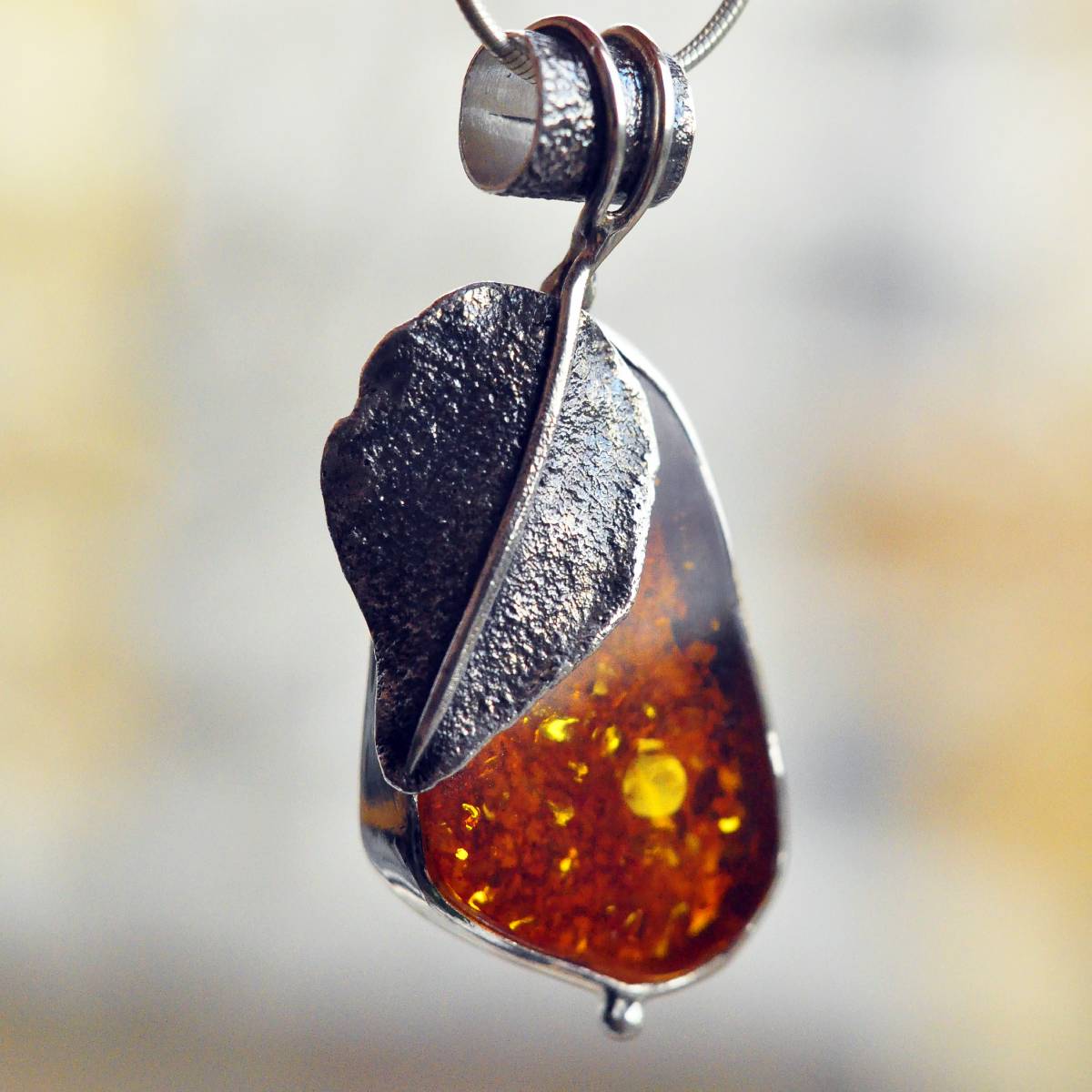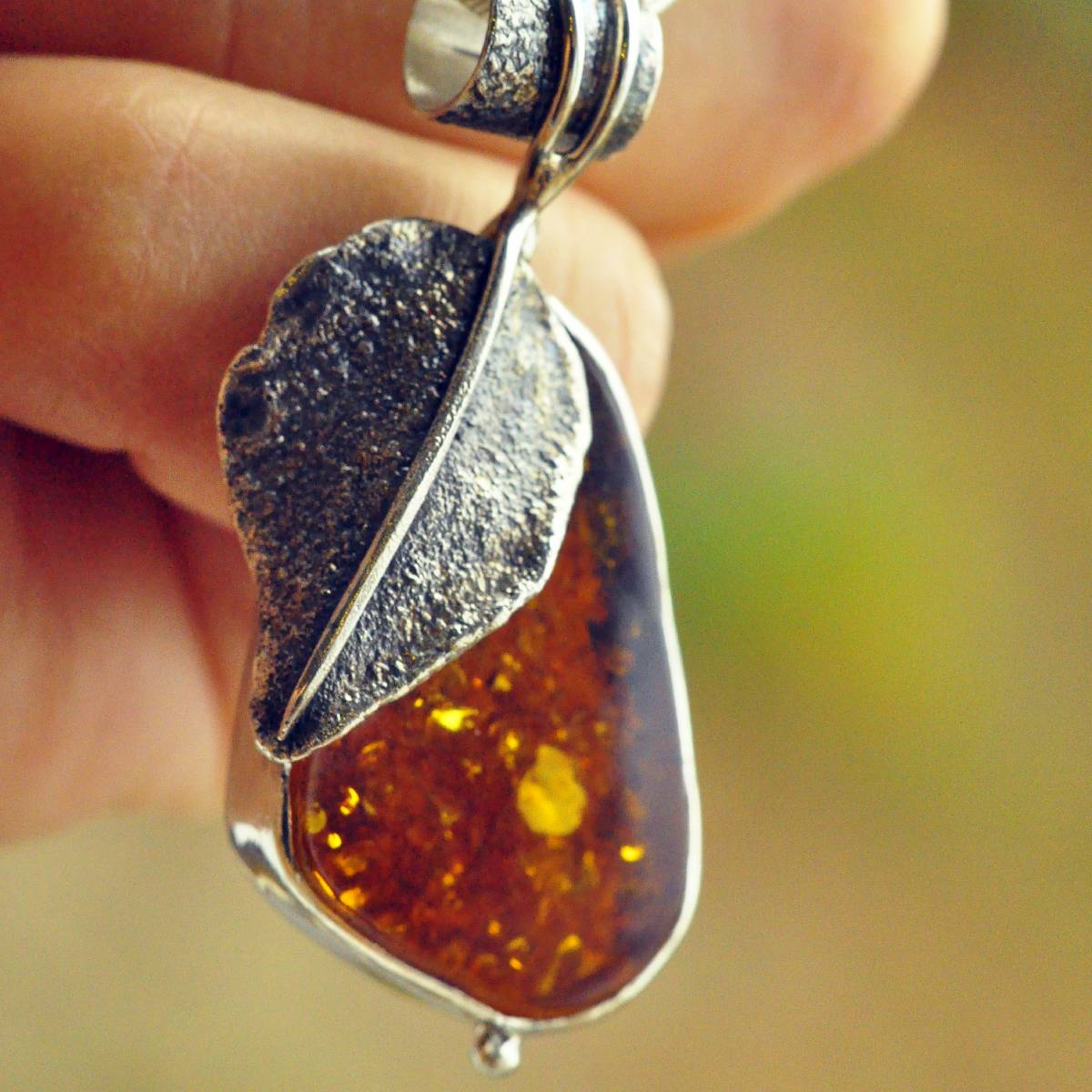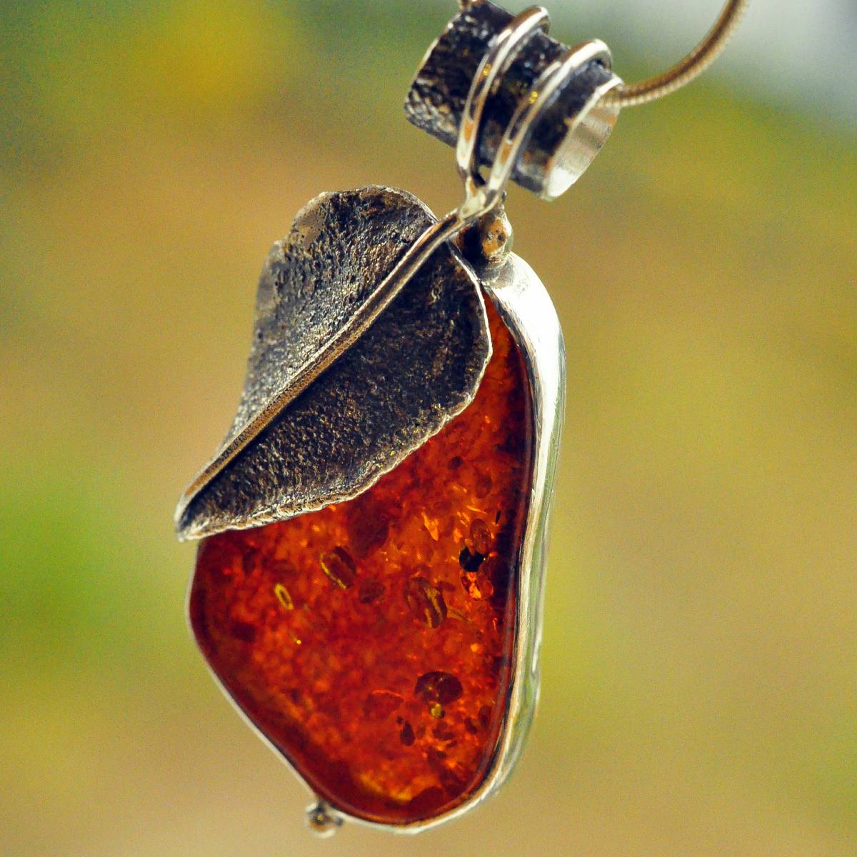 Lekka, fantazyjna zawieszka z bursztynem bałtyckim w kolorze ciemnego miodu oprawionym w srebro próby 925.