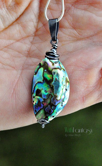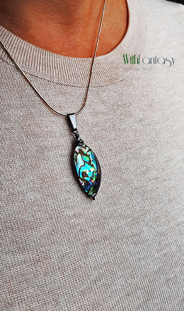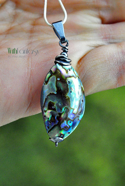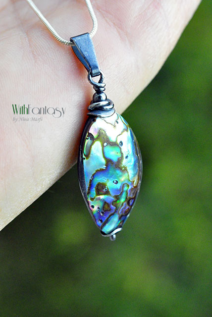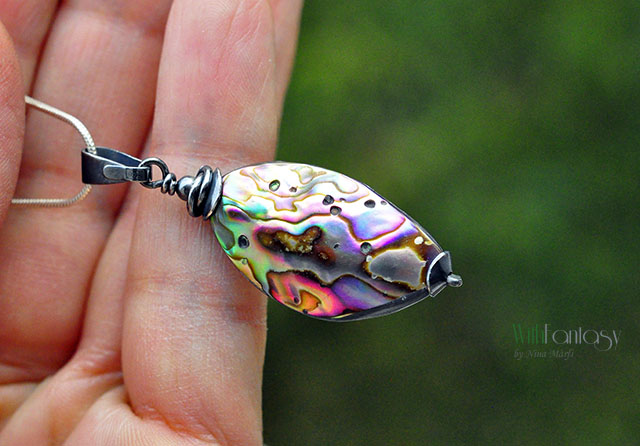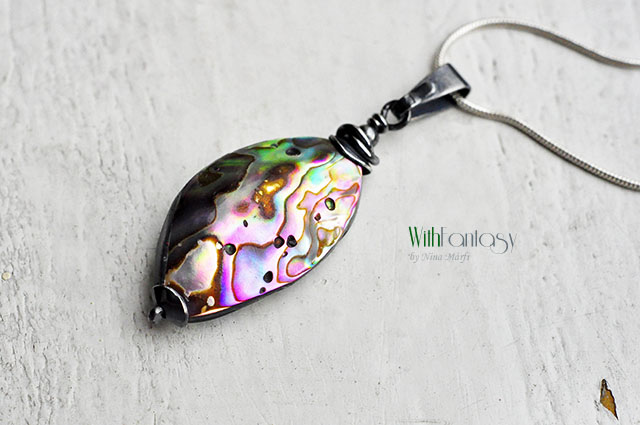 Kolorowy, lekki wisiorek z naturalnej muszli Paua, srebro próby 925, zaoksydowane i wypolerowane.