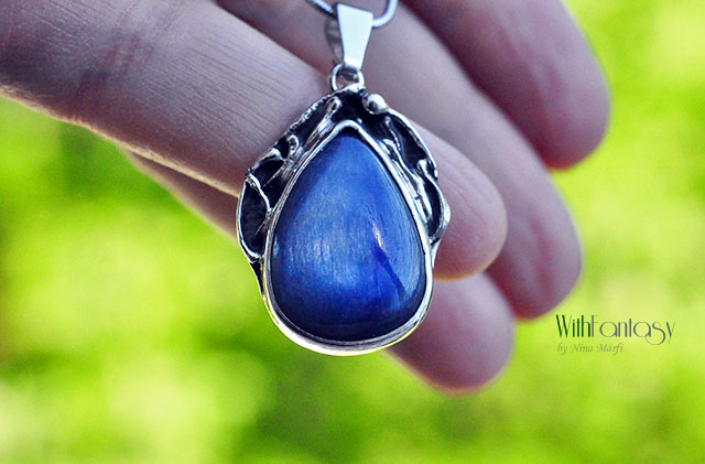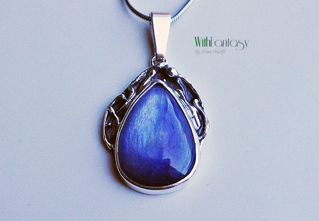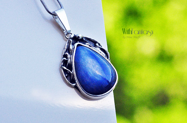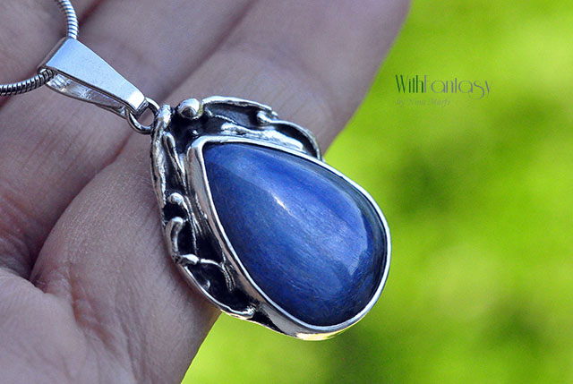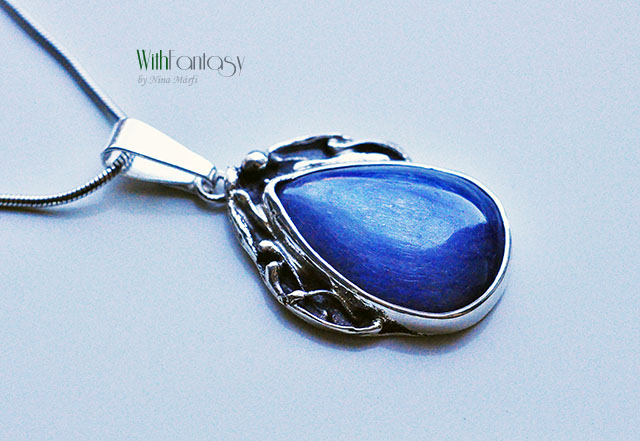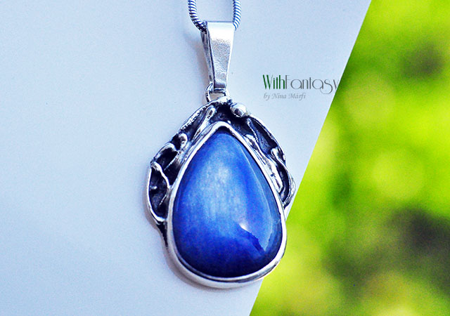Ręcznie wykonany, organiczny w charakterze srebrny wisior z pięknym kianitem. Srebro proby 925, oksydowane i polerowane, kamień naturalny w doskonałej jakości, intensywnie wybarwiony.