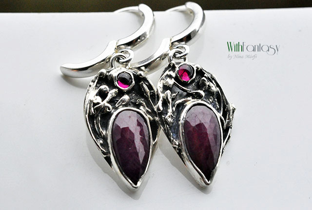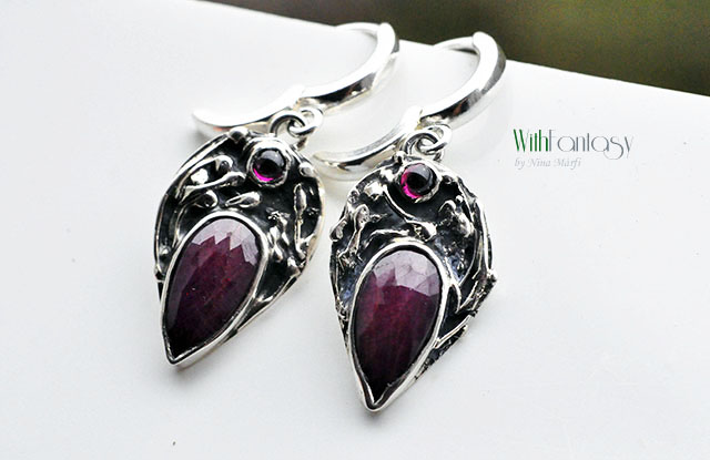 Nieco organiczne, baśniowe kolczyki wykonane ręcznie ze srebra próby 925, malinowych rubinowych kropli i malutkichokrągłych granatów.