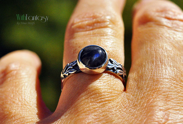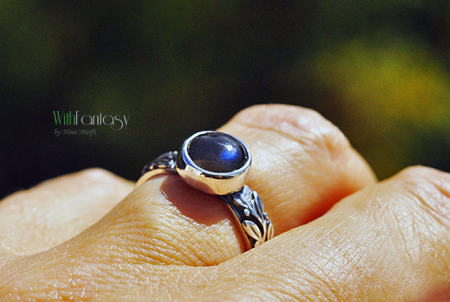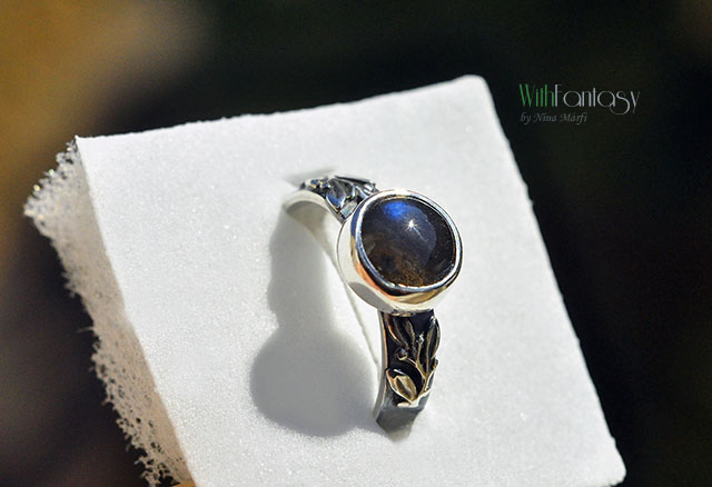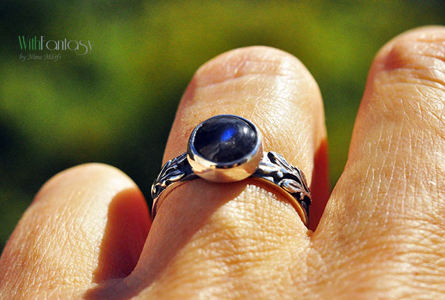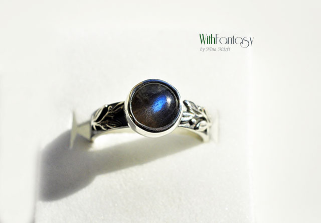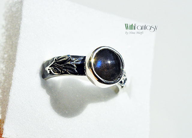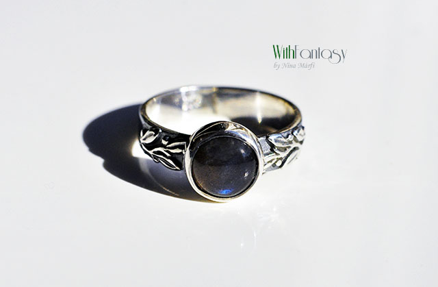 Dyskretny srebrny pierścionek z labradorytem pobłyskującym na niebiesko. Pierścionek wykonany ze srebra próby 925.