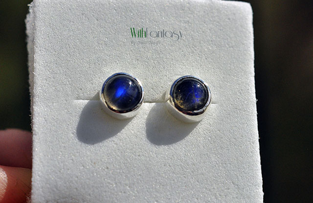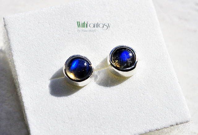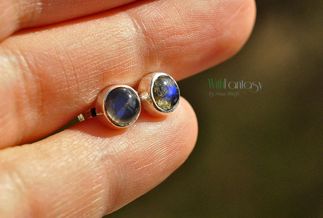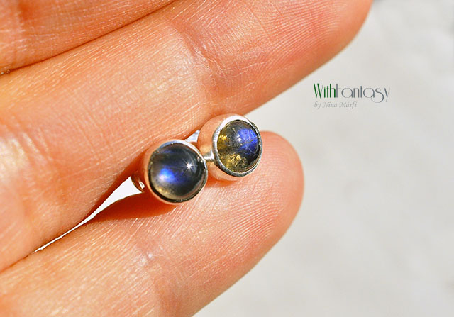 Drobne kolczyki sztyfty z ciemnymi labradorytami płonącymi granatowym światłem. Kamienie bardzo dobrej jakosci, oprawione ręcznie w srebro próby 925.