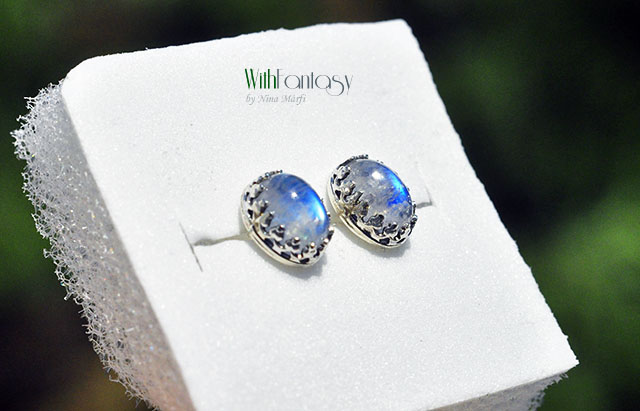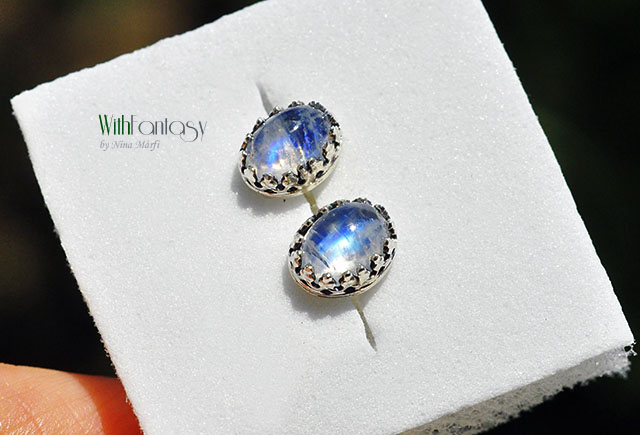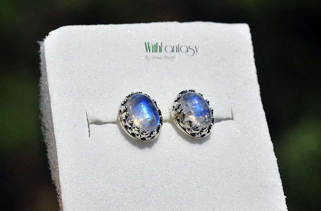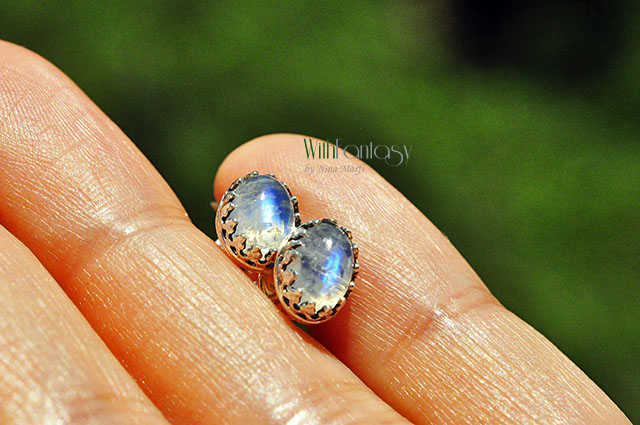 Malutkie, dyskretne sztyfty z kamieniami księżycowymi z nutką romantyzmu. Srebro próby 925, lekko oksydowane i polerowane.
